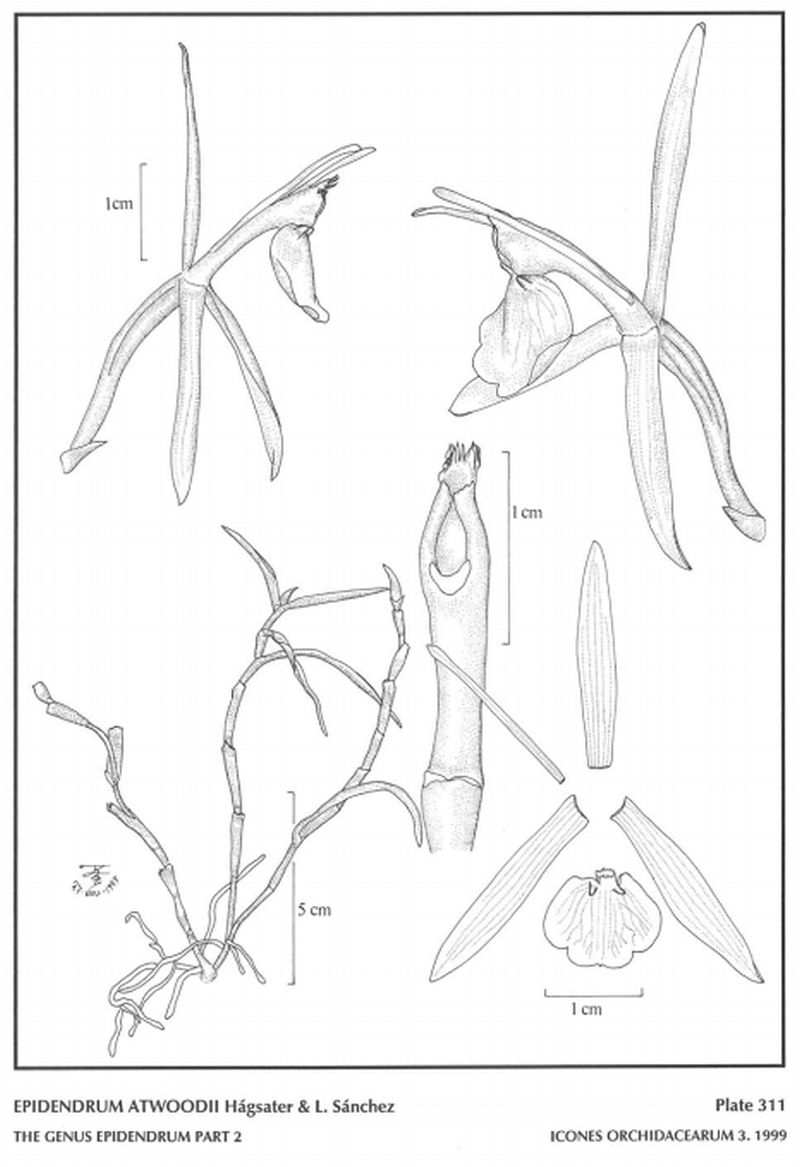 "Epidendrum atwoodii is part of GROUP Difforme c haracterized by the caespitose, sympodial plants, fleshy, pale green to glaucous leaves, apical inflorescence, sessile, rarely with a short peduncle, one-flowered to many-flowered, and then corymbose, without spathaceous bracts, fleshy, green to yellowish-green rarely white flowers. This species can be recognized by the linear to lanceolate leaves, successively single, greenish-white flower, ovary dilated, lanceolate sepals, linear petals, adnate to the basal third of the column, 3-lobed, flabellate lip, fimbriate, prominent c1inandrium. It is similar to Epidendrum mantis-religiosae which has narrowlly ovate sepals, narrowly ligulate petals adnate to the basal of the column, ovate lip, erose, short c1inandrium." Hagsarter etal 1999
