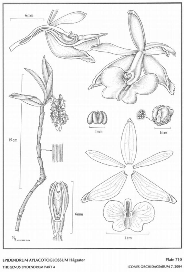 "Epidendrum aylacotoglossum belongs to the GROUP Arbuscula SUBGROUP Incomptum, which is recognized by the stems produced from the middle of the previous stem, wlth few leaves aggregate near the apex, the racemose inflorescence and the fleshy, usually green to black flowers. The species is recognized by the yellow flowers, the ancipitose peduncle of the inflorescence, prominently dorsally keeled lateral sepals, narrowly oblanceolate petals and the 3-lobed lip, the basal lobes orbicular deeply cordate, the apical lobe short, wide, emarginate, forming two obliquely semiovate lobes and the wide channel running down the middle of the lip with a short, narrow keel in between the inconspicuous calli, and the sigmoid column. The relationships of this species are not clear, the vegetative structure appears to be that of successive lateral sympodial growths, and the ancipitose peduncle of the inflorescence are reminiscent of the plant illustrated by Dunsterville and Garay as Epidendrum curtisii Hawkes in the IlIustrated Field Cuide of Orchids of Venezuela pg. 218. However, the channeled lip, is more like that of Epidendrum renilabium Schltr. or E. renilabioides Hágsater & Dodson, though neither runs down the full length of the lip and both, however, have a monopodial growth pattern, with short branches and bilobed, subcoriaceous leaves and wide petals. The sigmoid, upturned apex of the column of the new species is unique." Hagsater etal 2004