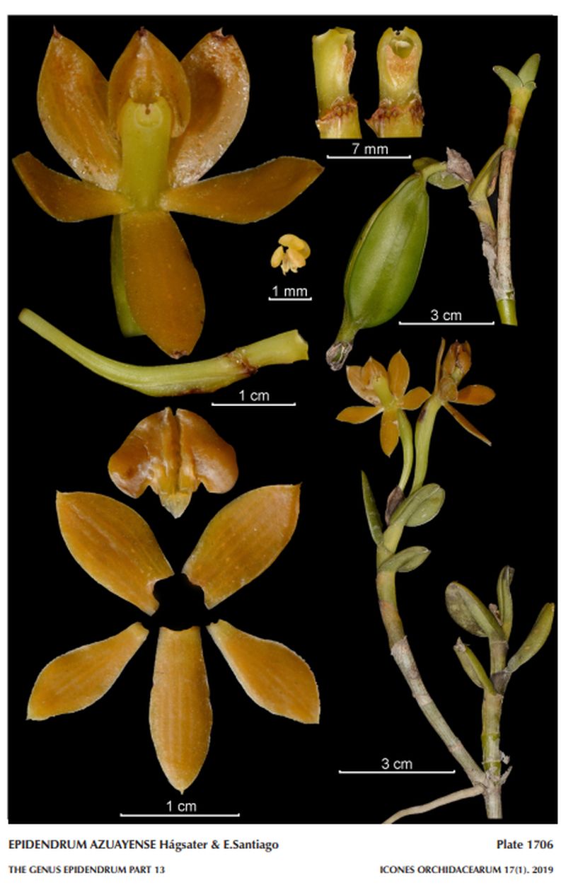 "Epidendrum azuayense belongs to the GROUP Geminiflorum , recognized by having a single, sympodial, scandent, straggling habit, a semiovate spathe, erect stems with 3 to 10 coriaceous leaves, few non-resupinate flowers, and a lip with laminar calli, disc flat. The new species is recognized by the oblong-elliptic leaves .4 to 2" x .32 to .6" [1.0 to 5.0 x 0.8 to 1.5 cm], 2 flowered inflorescence, flowers orange, column green, sepals .52 to .72" x .2 to .24" [13 to 18 x 5 to 6 mm]; petals .48 to .64" x .2 to .24" [12 to 16 x 5.0 to 6.0 mm], oblanceolate and slightly oblique, lip widely cordiform, obtuse. Epidendrum cuencanum has widely elliptic leaves 2.8 to 3.6" x 1.28 to 1.72" [7.0 to 9.0 x 3.2 to 4.3 cm], inflorescence 3 to 5 flowered, greenish white; column pale green; sepals .84 x 2.52" [21.5 x 6.3 mm]; petals .8 x .08" [20 x 2.0 mm], linear, and lip is cordiform, apex acute. Epidendrum geminiflorum Kunth is vegetatively similar, also 2 to 3 flowered, but the flowers are green to yellowish green, sepals and petals acuminate, lip 3-lobed, apically acuminate, lateral lobes semi-orbicular, small. Epidendrum philocremnum Hágsater & Dodson has similar leaves in size and shape, but the flowers are green, sepals .48 to .6" x .12 to .216" [12 to 15 x 3.0 to 5.4 mm], petals .48 to .56" x .92 to 1" [12 to 14 x 2.3 to 2.5 mm], oblong, and lip clearly 3-lobed with the mid-lobe triangular. Epidendrum geminiochraceum Hágsater, E.Santiago & Medina Tr. has plants to 14" [35 cm] tall, leaves 2 toi 3.4" x .48 to .8" [5.0 to 8.5 x 1.2 to 2.0 cm], oblong, 2 to 4 flowers fleshy, orange to ochre-orange, sepals acuminate, longitudinally somewhat convex, dorsal sepals .88 x .26" [22 x 6.5 mm], petals .74 x .16" [18.5 x 4 mm], lanceolate, lip .64 to .68" x .6 to .64" [16 to 17 x 15 to 16 mm], clearly 3-lobed, apex acuminate. Epidendrum geminiflorum Kunth is generally 2-flowered (rarely 3-flowered), flowers green or greenish-yellow, sepals .56 to .84" [14 to 21 mm] long, acute and apiculate, with the margin revolute, petals .576 to .76" [14.4 to 19 mm] long, narrowly lanceolate, lip canaliculate down the center in natural position, the margins then spreading, especially the lateral lobes, which are smaller than the mid-lobe." Hagsater etal 2019