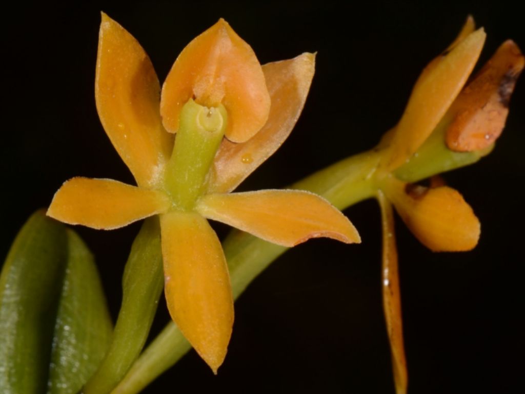 Found in Azuay and Cańar provinces of Ecuador in highlands straggling in bushes at elevations of 2850 to 3700 meters as a large sized, cold growing terrestrial with simple, cane-like, produced from a middle internode of the previous stem, terete at the base, somewhat laterally compressed towards the apex; base covered by non-foliar sheaths scarious, becoming fibrous and carrying Leaves 2 to 10, distributed throughout the stems, articulate, alternate, spreading, fleshy-coriaceous; leaf sheaths tubular, laterally compressed somewhat infundibuliform in dry specimens, longitudinally striated; blade oblong-elliptic, apex unequally bilobed, margin entire leaves that blooms in the winter, spring, summer and early fall on a terminal, arising through 1 to 2 spathes, .4 x .2" [10 x 5 mm], tubular at base, conduplicate at the apex (narrowly obovate when spread), apex obtuse, blackish brown when in flower, membranous, margin entire, peduncle .6 to .8" [1.5 to 2.0 cm] long, laterally compressed, totally hidden by the spathe, provided in the middle with a bract .24 to .4" [6 to 10 mm] long, rachis .2 to .4" [5 to 10 mm] long, ca. 2.2" [5.5 cm] long including the flowers, erect, simultaneously 2 flowered inflorescence with much shorter than the ovary, narrowly triangular, acuminate, embracing floral bracts and carrying , non-resupinate, erect, segments fleshy, rigid, orange colored flowers with the column green and no fragrance.