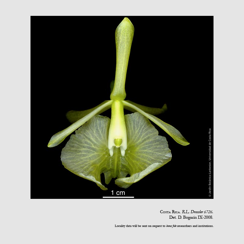 Found in Nicaragua, Costa Rica, Panama and Venezuela in seasonally dry forests as a small sized, warm to cool growing epiphyte at elevations around 500 to 1850 meters with a short stem carrying several [6 to 7], alternate, conduplicate below and basally clasping, oblong-elliptic, apically unequally bilobed leaves that blooms in the spring on a short, single flowered, terminal inflorescence arising on a mature growth and carrying 5 to 10, simultaneous, nocturnally fragrant flowers held in an apical umbel.