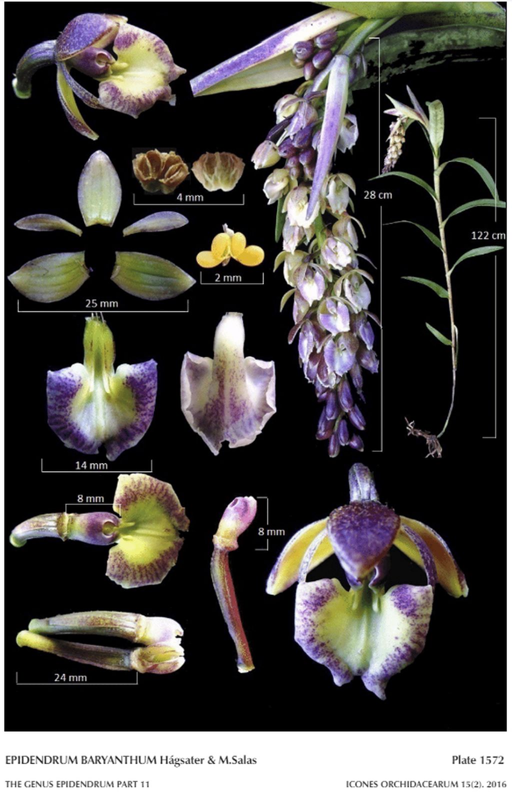 "Epidendrum baryanthum belongs to the GROUP Ferreyae which is characterized by the sympodial, caespitose habit, canelike stems with numerous leaves, apical inflorescence subtended by 1 to 2 large spathes, and a nutant, heavy racemose to paniculate inflorescence with numerous large, fleshy, attractive flowers. The new species is recognized by the large sub-orbicular lip in outline, the margins revolute, with the mid-lobe short, wide and deeply emarginate, thus bi-lobed, formed by two semicircular small lobes strongly revolute, not evident in natural position; sepals .48 to . 64" [12 to 16 mm] long, petals are oblanceolate, sub-acute, .088 to -12" [2.2to 3.0 mm] wide. It is similar to Epidendrum ferreyrae Hágsater & Ric.Fernández, which has a clearly 3-lobed lip with the lateral lobes dolabriform and the mid-lobe subtriangular, narrow; sepals .6 to .72" [15 to 18 mm] long, column .4" [10 mm] long. Epidendrum lesteri Hágsater & Dodson has 3-lobed, margin erose-crenate; lateral lobes sub-reniform; mid-lobe rectangular, comparatively large, the apex truncate, somewhat bilobed, short-apiculate; sepals .64" [16 mm] long, petals oblanceolate, apically rounded, .08" [2 mm] wide. Epidendrum orthoclinium Hágsater & Dodson, has a 3-lobed lip, the lateral lobes semi-circular, margin dentate, mid-lobe spatulate; sepals .44 to .48" [11 to 12 mm] long, petals oblanceolate, narrow, acute, .048" [1.2 mm] wide, column arched upwards at the clinandrium." Hagsater etal 2016