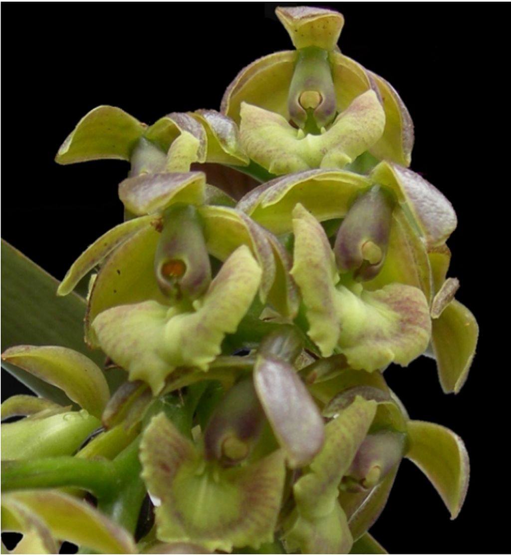 Found in central Peru at elevations of 1940 to 3000 meters as a giant sized, cold growing epiphyte with simple, cane-like, erect, thick stems carrying all along the apical 2/3's of the stem, 11 to 15, spreading, alternate, distichous, articulate, coriaceous, narrowly lanceolate, acute, minutely apiculate, margin entire leaves that blooms in the fall on a terminal, paniculate, heavy, arching-nutant, peduncle to 2" [5 cm] long, terete, thick, rachis to 11.2" [23 cm] long, nearly totaly hidden by the flowers, paniculate, nearly simultaneous many flowered inflorescence with much shorter than the ovary, linear-triangular, acute floral bracts and carrying up to 46 flowers on the main spike and about 6 each on the lateral branches each flower with the sepals and petals pale green, most dorsally dark purple, lip pale green, the disc surrounded towards the margin by purple dots along the veins, dorsally pale greenish somewhat dotted purple along the center, column greenish tinged purple towards the apex.