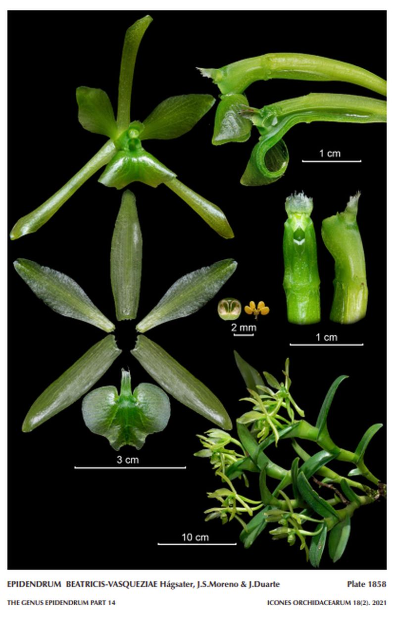 "Epidendrum beatricis-vasqueziae belongs to the DIFFORME GROUP which is characterized by the caespitose, sympodial plants, fleshy light green to glaucous leaves, the apical inflorescence without any spathe, sessile, rarely with a short peduncle, oneflowered to a glomerule, fleshy, and flowers green to yellowish-green, rarely white. The species is recognized by the somewhat compressed stems with 4 unequal leaves, the 2 to 5flowers , opening in succession but evetually all open at one time, large, the sepals 1.46" [36 mm] long, the petals 1.24" x .368" [31 x 9.2 mm], narrowly rhombic, base cuneate, the lip 3-lobed, strongly revolute in natural position with the lateral lobes obliquely revolute thus appearing triangular from in front, lateral lobes obliquely sub-orbicular, mid-lobe trapezoidal, the apex widely crescent shaped, and the column .36" [9 mm] long, short and thick. Epidendrum putumayoënse Hágsater & L. Sánchez has shorter stems, 1.6" [3.5 cm] long, sepals .98 to 1" [24.5 to 25.0 mm] long, narrowly oblanceolate, petals .92 to 194" x .1 to .12" [23.0 to 23.5 x 2.5 to 3.0 mm], narrowly oblanceolados, lip .48 x .96" [12 x 24 mm] obtrapezoid. Epidendrum platychilum Schltr. has similarly sized flowers, sepals 36 mm long, laterally compressed stems, 1 to 2 green flowers, and inflated, terete ovary, a cordiform lip with several prominent veins, and a column .36" [9 mm] long, thin. Epidendrum pseudokillipii Hágsater & L.Sánchez has taller plants, to 15.2" [38 cm] tall, 7 leaves, smaller flowers, sepals .68 to .72" [17 to 18 mm] long, petals .64 X .26" [16 x 6.5 mm], obovate-spatulate, the lip widely cordiform, obtuse, and the column short, .34 to .36" [8.5 to 9.0 cm] long." Hagsater etal 2021