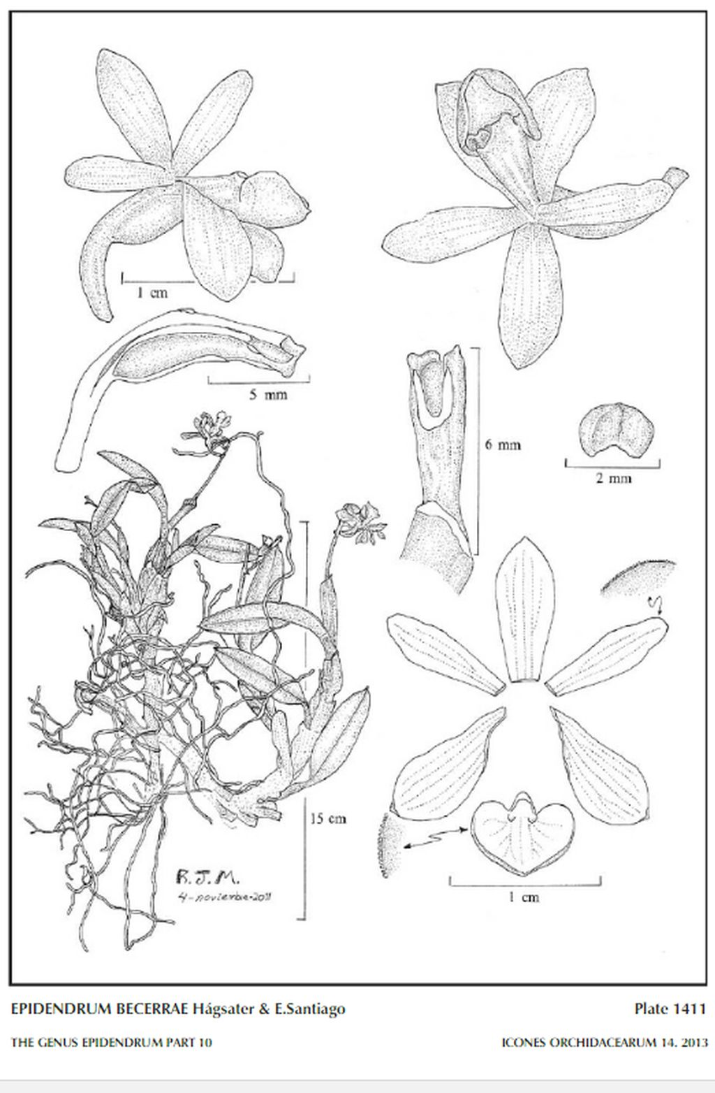 "Epidendrum becerrae belongs to the GROUP Saxicola characterized by the pseudobulbous stems, racemose inflorescence subtended by a prominent spathaceous bract, and the few, showy flowers, either resupinate or non-resupinate. The species is recognized by the creeping habit, fusiform, uni-foliate pseudobulbs, the erect, few-flowered inflorescence, non-resupinate, second, purple flowers, the petals oblanceolate, the cordiform lip united to the column throughout. It is somewhat reminiscent of Epidendrum micro-cattleya, but that species has 2 flowers, with the lip oriented inwards, towards each other, the petals about as wide as the sepals, and the lip produced from a sigmoid claw at the middle of the column, the column itself with a pair of prominent, short, wide, dolabriform wings. Epidendrum saxicola Kraenzl. has somewhat larger flowers, sepals .6" [15 mm] long, a prominent, funnel-shaped clinandrium-hood, and the convex lip is .4 x .4" [10 x 10 mm], sub-orbicular, somewhat pentagonal with the margin crenulate and spreading from the column, without embracing it. Epidendrum microcattleyioides D.E.Benn. & Christenson has 4 non-resupinate, yellow flowers, the margin white, the flowers crowded at the apex of the peduncle, which does not surpass the surrounding spathaceous bract, the lip is reniform with the apex widely emarginate, the petals wide, obovate-spatulate, the lateral sepals are not obliquely joined to the column, and the ovary is geniculate." Hagsater etal 2013