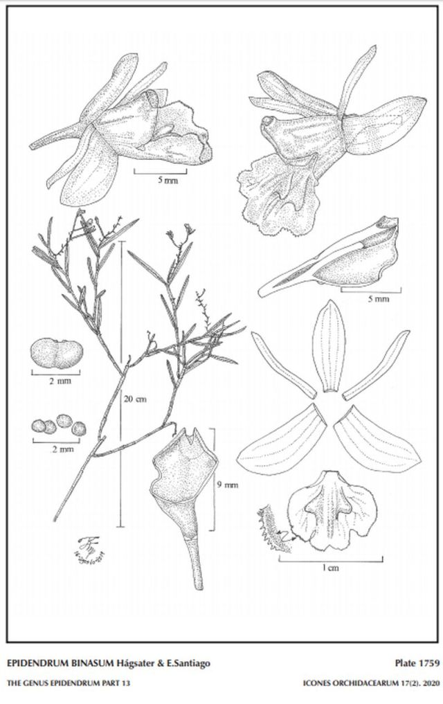 "Epidendrum binasum belongs to the GROUP Diothonea SUBGROUP Diothonea which is characterized by the branching plants, the linear-lanceolate to oblong, bilobed leaves, the racemose, arching-nutant inflorescence, the membranaceous flowers (rarely fleshy), the entire to 3-lobed, ecallose lip with the margin erose without or with 1 to 10 thin, smooth to erose keels, the column completely to obliquely united to the lip, and the anther reniform. The new species is recognized by the thin stems and narrow linear-lanceolate leaves .48 to 1.88" x .08 to .16" [1.2 to 4.7 x 0.2 to 0.4 cm], the lax-flowered inflorescence with a flexuous rachis, 12 to 13 creamy pink colored flowers, sepals .352 to .376" [8.8 to 9.4 mm] long, elliptic to oblong-elliptic, apex obtuse, the lip 3-lobed with the margin short ciliate, the disc with two prominent laminar, triangular, noselike keels, and the column only partly and obliquely united to the lip. Epidendrum tropinectarium is vegetatively similar but the flowers are pale pink or brown-pink, sepals .426 to .456" [10.6 to 11.4 mm] long, oblanceolate to narrowly elliptic (the lateral sepals), apex acute to acuminate, the lip 3-lobed with the margin dentate, the disc with 2 short, thin, keels adnate at the base, and the column totally united to the lip. Epidendrum dodsonii Hágsater & E. Santiago has longer leaves, 2.2 to 4.64" [5.5 to 11.6 cm] long, a rachis of the inflorescence straight, flowers cream or creamy brown colored, sepals .28 to .304" [7.0 to 7.6 mm] long, petals .268 x .08" [6.7 x 2.0 mm], narrowly ovate, the margin of the lip biserrate, and the disc with 5 narrow keels. Epidendrum yarumalense Hágsater & E. Santiago has shorter plants, to 8" [20 cm] tall, leaves lanceolate, inflorescences 1.2" [3 cm] long with 7 to 9 green flowers tinged red, sepals .32 to .48" [8 to 12 mm] long, the lip with the margin dentate, and the disc with 4 to 5 low keels."Hagsater etal 2020