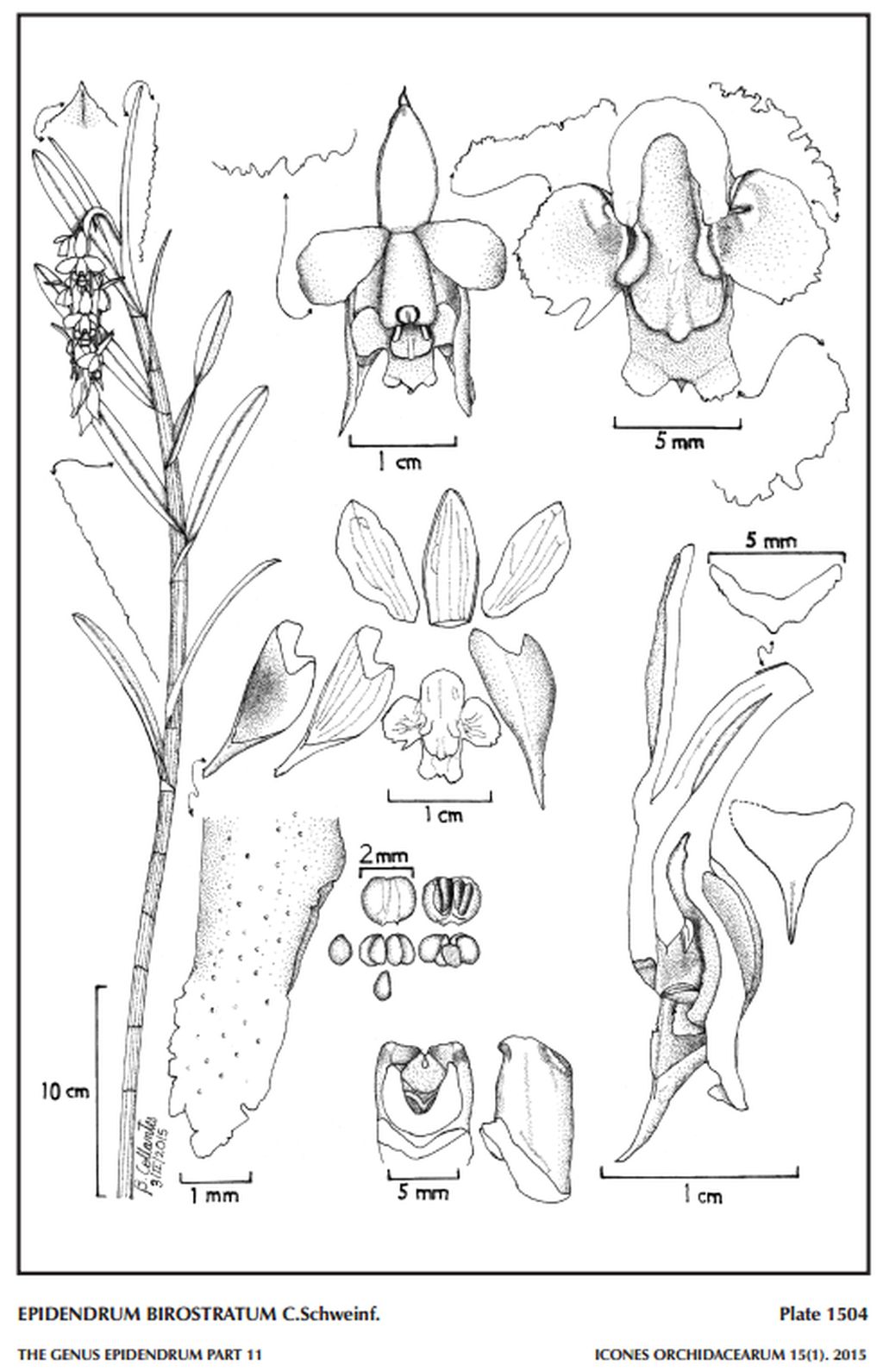 "Epidendrum birostratum belongs to the GROUP Coronatum SUBGROUP Aristisepalum, which has a caespitose habit, simple stems, subcoriaceous leaves, an arching-nutant, racemose inflorescence without spathaceous bracts, a thickened disc on the 3-lobed lip, and especially the lateral sepals which are apically prominently aristate-complanate, .6 to .8" [15 to 20 mm] long. The species is recognized by the has leaves 2.6 to 5.2" x .52 to .6" [6.5 to 13 x 1.3 to 1.5 cm], the lip with dolabriform-rounded lateral lobes, mid-lobe as long as the lateral lobes, cuneate, sub-quadrate, the apex sinuous-truncate, 3-dentate; disc with the thickened plate sub-quadrate-ovate, basal flowers open first. Epidendrum incahuamanii Collantes & Hágsater has linear-lanceolate leaves 1 to 6" x .12 to .36" [2.5 to 15 x 0.3 to 0.9 cm], lateral lobes dolabriform-sub-elliptic, oblique, the disc thickened into a semi-circular plate, traversed by a prominent mid-rib extending to the apex of the mid-lobe .1 x .24" [2.5 x 6 mm], semicircular, apex usually retuse; apical flowers open first. Epidendrum aristisepalum Hágsater & Dodson from southern Ecuador has similar leaves 2.4 to 5.8" x .28 to .44" [6 to 14.5 x 0.7 to 1.1 cm], but the ecallose lip has a sub-orbicular mid-lobe with the disc thickened into 3 prominent longitudinal ribs. Epidendrum jalcaënse Chocce-Peńa, Dalström, Hágsater & J.Arnaiz has wider leaves, 1.88 to 2.64" x .4 to .6" [4.7 to 6.6 x 1.0 to 1.5 cm], bright orange flowers with a wide, 4-lobed, ecallose lip, with 5 thickened ribs on the disc." Hagsater etal 2015