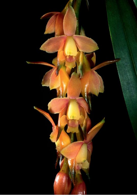 Found in Cusco department Peru and Bolivia in elfin cloud forests at elevations of 3000 to 3650 meters as a large to giant sized, cold growing epiphyte or terrestrial with simple, canelike stems enveloped in the lower half by nonfoliaceous tubular sheaths and carrying 7 to 12, distichous, suberect, subcoriaceous, articulate, oblong-elliptic, subacute, mucronate, irregularily crenulate margined leaves that blooms in the late fall through winter on a terminal, occuring only once, racemose, arching nutant, 5.8" [14.5 cm] long, dense, successively to 14 flowered inflorescence with basal, lunate, short, apex mamillate, the upper ones transversely sub deltate, caudate floral bracts and carrying successive flowers that open from the base up and eventually all are open at one time.