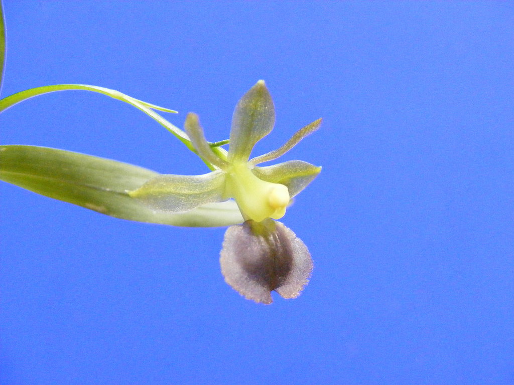 This species is known for having 2 apical leaves on the stem, green flowers with a slight tint of bronze on the sub-orbiuclar lip that is slightly emarginate and bisulcate in front of the calli.