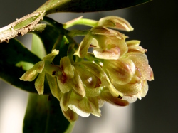Found in Costa Rica and Panama at elevations of 1500 to 2500 meters as a medium sized, cool to cold growing epiphyte with simple, cane-like, terete, thin, straight stems carrying 2 to 4, towards the apex, alternate, subcoriaceous, oblong, entire margin, acute, conduplicate into the base leaves that blooms in the fall through winter on a terminal, occuring only once, racemose, arching, thin, ancipitose inflorescence with a bract towards the middle that is similar to the shorter than the ovary, triangular, acuminte floral bracts and carrying 6 to 9 successively opening, non-resupinate, nocturnally fragrant flowers with olive green tepals and a lighter lip with a purple cast over it.