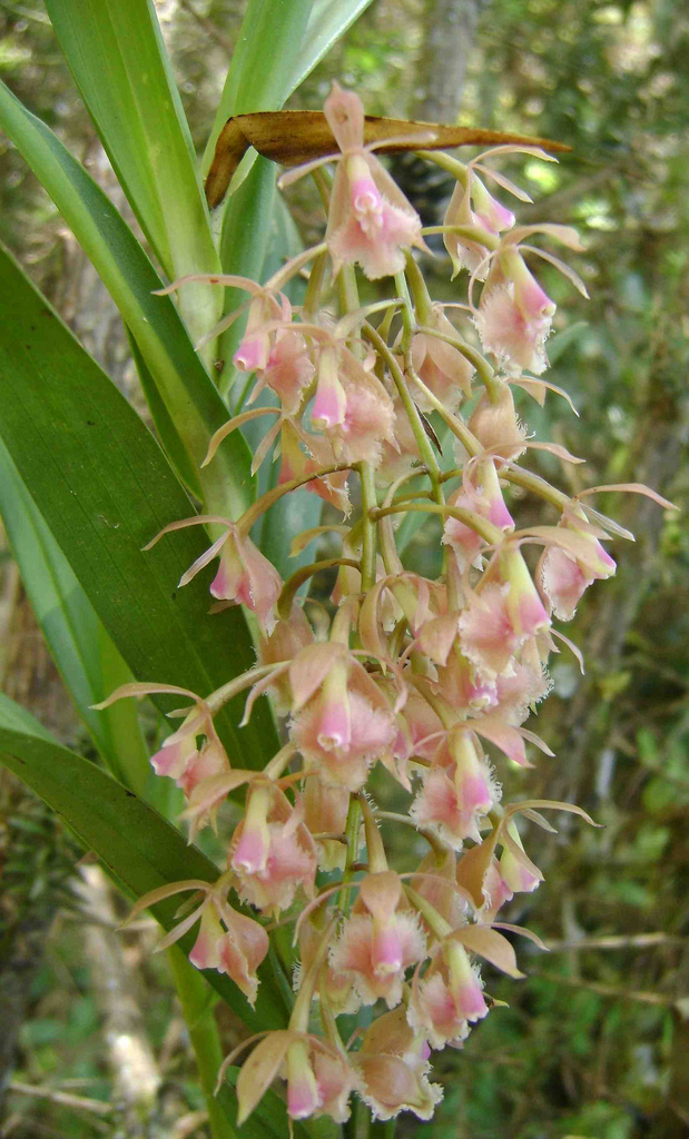 Found in Peru in montane wet forests at elevations around 2600 to 3200 meters as a medium sized, cold growing, slender, grasslike epiphyte with slender, branching from the near basal nodes of the previous stem, branches ascending, terete towards the base, laterally compressed towards the apex stems carrying, in the upper 1/2 the stem, distichous, linear, more or less narrowed above with an acute to acuminate apex, strongly ascending, loose, basally clasping leaves that blooms in the summer on a terminal, paniculate, 2 to 3 strict branches arising through an elongate, infundibuliform spathe, 6.8" [17 cm] long including the peduncle, loosely few to many flowered inflorescence which has minute, setaceous, much shorter than the ovary floral bracts.
