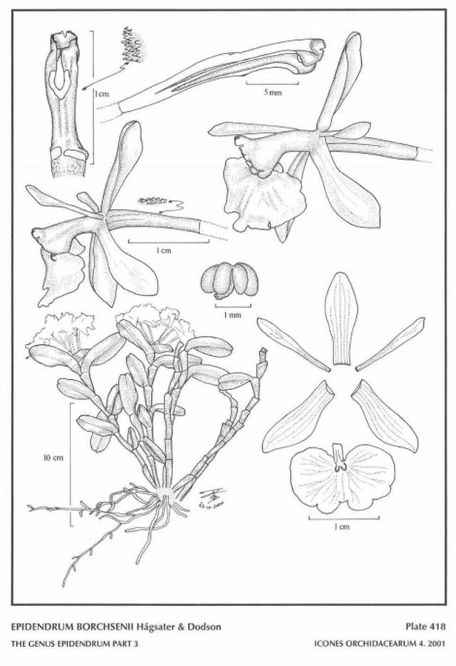 "Epidendrum borchsenii belongs to the GROUP Difforme characterized by the caespitose, sympodial plants, fleshy, pale green to glaucous leaves, apical inflorescence, sessile, rarely with a short peduncle, one-flowered to many-flowered, and then corymbose, without spathaceous bracts, fleshy, green to yellowish-green rarely white flowers,. The species can be recognized by its laterally compressed stems, larger leaves, inflated ovary, suborbicular lobes of the midlobe of the lip, non-keeled lip, subglobose calli, prominent, tripartite clinandrium, the central part bifid, papillose column and ovary. It is similar to E. carnevalii, a species endemic to Venezuela, in the central and western section of the Coastal Range, but that has somewhat laterally compressed stems, short leaves, divergent, prominent calli, entire clinandrium. Epidendrum chlorocorymbos Schltr., from the Atlantic Slopes from Mexico to Panama has larger plants and flowers, terete stems, more than 10 flowers, short clinandrium and glabrous column and ovary. Epidendrum littorale Hágsater & Dodson from Ecuador and Colombia, in the coastal plain at the base of the western andean ridge, has terete stems, broad, prominent, crenate midlobe of the lip, with a wide, shallow apical sinus, entire clinandrium and glabrous column and ovary. Epidendrum romanii Hágsater & Dodson, endemic to Ecuador, has terete stems, ascending leaves, entire, obconical clinandrium and glabrous column and ovary." Hagsater etal 2001