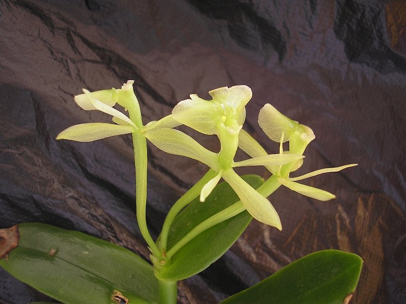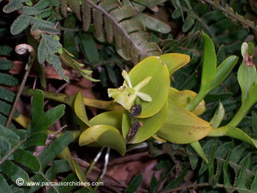 Found in Puerto Rico, Dominican Republic and Guadeloupe in humid broadleafed forests at elevations of sealevel to 1000 meters as a small sized, hot to warm growing epiphyte with reed-like, somewhat laterally compressed, not ancipitose, flexuous stems carrying 6 to 12, elliptic to narrowly ovate, obtuse, basally clasping leaves that blooms in the summer on a terminal, subumbellate, short, 1 to 8 flowered inflorescence carrying simultaneously opening flowers that are fragrant at night and smell of cucumbers.