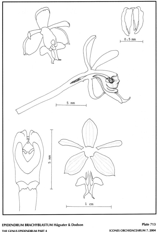 "Epidendrum brachyblastum belongs to the GROUP Biccirhatum which is characterized by the caespitose habit, simple, cane-like stems, short, arching, pluriracemose, subcapitate inflorescence, narrowly spathulate petals, 3-lobed lip, generally with cirrhate apical lobes and unequal, laterally compressed poliinia, with the inner pair smaller. The new species has deep green flowers with the lip and apical half of the column snow white, the lateral lobes of the lip are narrow and the apical cirrhose and short. It closely resembles Epidendrum tiwinzaense Hágsater & Dodson which has pale green flowers, with the column and lip cream-colored, sepals .24 to .28" [6 to 7 mm] long, the lip with very wide, dolabriform lateral lobes. It also closely resembles Epidendrum bicirrhatum which has opaque, pale cream-orange flowers, the sepals and petals green at the base, the tips of the calli keels lavender, and the column white at the base, cream-yellow above. Epidendrum hugomedinae Hágsater & Dodson is vegetatively similar, but has very attractive, fragrant, snow-white flowers with the keels of the lip tinged violet and the obcuneate midlobe formed by two, somewhat divergent, rounded, lobes. The Bolivian Epidendrum ophidion Dodson & Vásquez is quite similar, but has successive, white flowers with three purple lines on the disc of the lip, pustulate sepals .24 to .32" [6 to 8 mm] long, and the dolabriform lateral lobes have a crenulate margin." Hagsater etal 2004