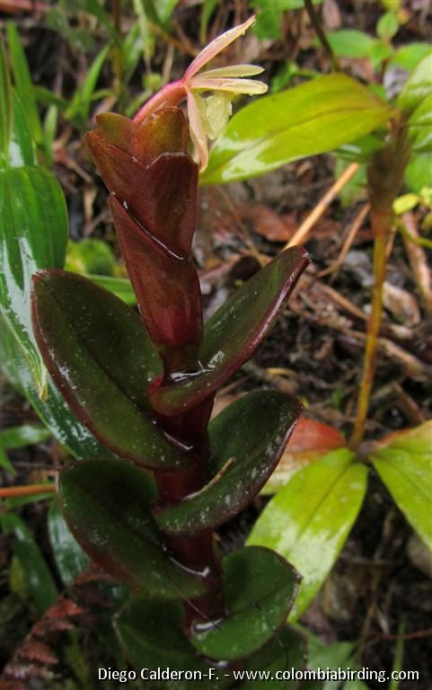 Found in west central Colombia on the western slope of the Cordillera Occidental in cloud forests at elevations around 2300 meters as a large sized, cold growing terrestrial with simple, cane-like, laterally compressed, ancipitose, wide, straight stems carrying numerous, all along the stem, alternate, articulate, elliptic, oblong, rounded apically leaves that blooms in the spring [probably throughout the year] on a terminal and lateral, racemose, producing successive racemes in time, 2.2" [5.5 cm] long including the short peduncle, successively single, few flowered inflorescence enveloped by, tubular at the base, conduplicate above, imbricating, ancipitose, subacute bracts and has much shorter than the ovary, conduplicate, subacute, imbricating floral bracts.