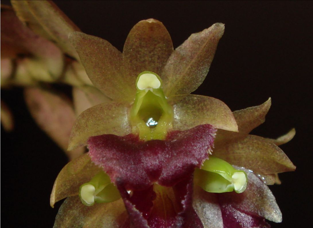 Found in western Venezuela and Colombia on the Cordillera Central of the Andes at elevations around 1950 to 3000 meters as a mini-miniature to miniature sized, cold growing epiphyte with a pendent, simple, cane-like, laterally compressed, straight branching from the base stems carrying 5 to 9, all along the stem, distichous, alternate, succulent, articulate, ovate, tridentate, middle aristate, apical margin somewhat erose leaves that blooms in the later spring through mid fall on a terminal, erect, ocurring only once, arising through a condulicate, wide, semi-orbicular, oblique spathe, pendent, peduncle enveloped completely by the spathe, 1.6 to 1.84" [4 to 4.6 cm] long, simultaneously 4 to 5 flowered inflorescence with small, much shorter than the ovary, triangular, acute clasping floral bracts and carrying resupinate, greenish, non-fragrant flowers with ovary and dorsal surface of the sepals minutely dotted with reddish dots and the lip is a deep burgundy red except for the greenish ribs on the disc.