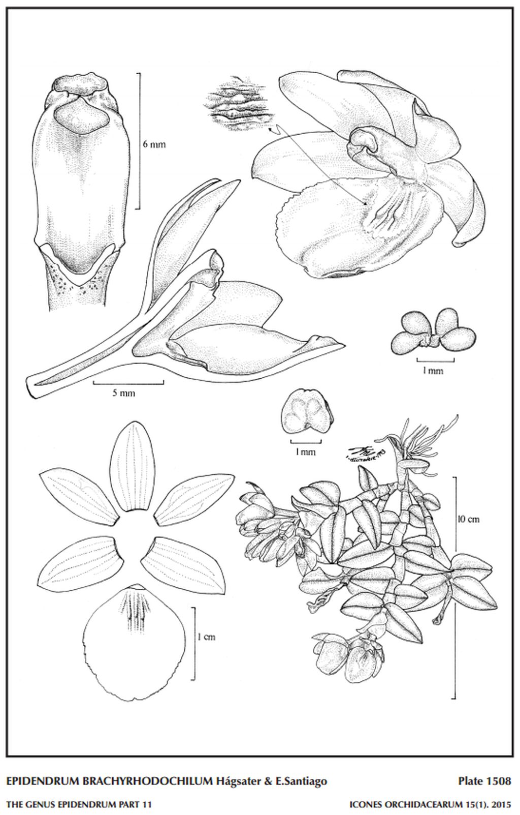 "Epidendrum brachyrhodochilum belongs to the GROUP Megalospathum characterized by the caespitose but branching habit, many-leaved stem, fleshy, oblique leaves, a short, few flowered raceme subtended by large semi-ovate spathaceous bracts, resupinate flowers, the column more or less united to the lip; the SUBGROUP Megalospathum has the calli substituted by long, low rib. The species is recognized by is short plants 3 to 5.2" [7.5 to 13 cm] long, sepals elliptic, .44 to .48" [11 to 12 mm] long, lip with 3 parallel ribs all the same size and length, the lateral pair bifurcate at the base and thus appearing as 5 ribs, the lateral ribs very short, divergent, column widened towards the apex, peduncle and rachis of the inflorescence totally hidden within the spathes. Epidendrum rhodochilum (Schltr.) Hágsater & Dodson has longer plants 6 to 9.6" [15 to 24 cm] long, sepals ovate-oblong, .6 to .68" [15 to 17 mm] long, the lip with three low, narrow ribs in place of the calli, the disc minutely pubescent. Epidendrum megalospathum Rchb. f., which is found sympatric with the new species, has a more elongate inflorescence, sepals oblong to oblong-elliptic, .6 to .72" [15 to 18 mm] long, petals lanceolate, acute, the lip ovate, base cuneate, with two lower ribs in the middle forming a “V” shaped structure, and then minutely papillose. The flowers of this small group of species are somewhat similar to E. arevaloi (Schltr.) Hágsater, though the plant habit of the latter species is typical of GROUP Diothonea." Hagsater etal 2015