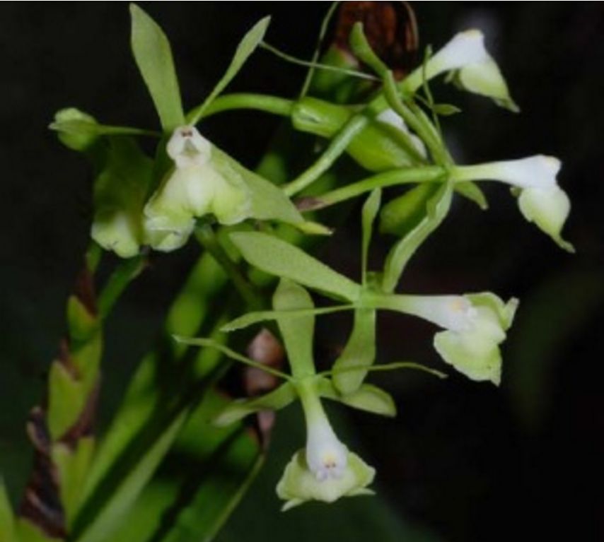 Found in Espirito Santo, Rio de Janiero, Minas Gerais, Sao Paulo and Parana states of Brazil in the Atlantic rain forests as a large sized, warm growing orchid with cane-like, simple, terete, thin, erect, straight stems carrying to 10, alternate, spreading, articulate, subcoriceous, unequal in size, basally shorter, oblong-elliptic, acute, margin entire leaves that blooms in the mid fall through late spring on a terminal, erect, slightly paniculate, peduncle subsessile, enveloped by 2 to 3 prominent, widely triangular, acuminate, partly imbricate bracts, rachis 1.72 to 2" [4.3 to 5 cm] long, thin, straight, laxly, simultaneously 8 to 13 flowered inflorescence with prominent, much shorter than the ovary, linear-lanceolate, long-acuminate, amplexicaul floral bracts and carrying resupinate, sweetly fragrant, green overall flowers with the apex of column and the disc of the lip white.