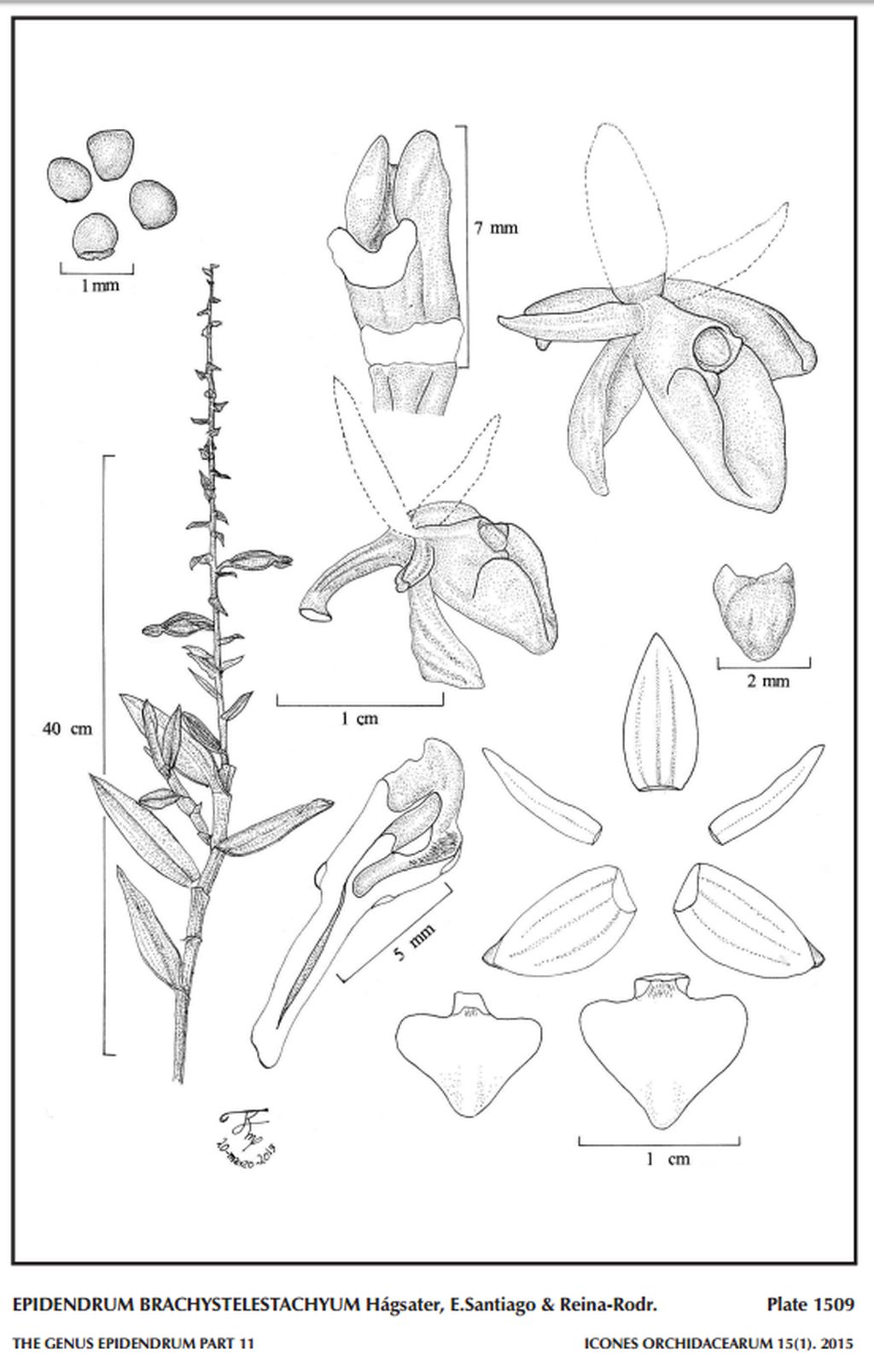 "Epindendrum brachythyrsus belongs to the GROUP Pseudepidendrum which is characterized by caespitose plants, cane-like stems, acute to acuminate leaves, usually apical inflorescence, without any spathaceous bract, though it may have several bracts, the mostly filiform petals and the lip usually 3-lobed (with 3 parallel fleshy keels), the apical lobe often bifurcate, the “bird-wing” type pollinia, at least the inner pair, and SUBGROUP Densiflorum where the short-pedunculate inflorescence is paniculate, flowering only once, flowers are green, the apex of the column and disc of the lip creamy-white, the calli sometimes tinged purple, the petals are linear-oblong to linear-oblanceolate, never filiform, and the pollinia unequal in shape, only the inner pair “bird-wing” like. The species is recognized by the thin stems .2 to .4" [0.5 to 1 cm] in diameter, the lax-flowered inflorescence shorter than the apical leaf, sepals oblanceolate, obtuse, .48 to .52" [12 to 13 mm] long, petals linear-oblong, .6" [1.5 mm] wide; the lip as wide between the lateral lobes and the lobes of the mid-lobe. Epidendrum noackii Cogn. has shorter stems, 14 to 20" [35 to 50 cm]tall, with narrow leaves, .6 to .88" [1.5 to 2.2 cm] wide, sepals ligulate-oblanceolate, acute, petals linear; the lip is wider between the lateral lobes than between the lobes of the mid-lobe. Epidendrum hassleri Cogn. from Paraguay and Argentina, has robust stems .4 to .6" [1.0 to 1.5 cm] in diameter, sepals spatulate-oblanceolate, petals linear-oblanceolate to linear oblong, and the lip wider between the lateral lobes than between the lobes of the mid-lobe. Epidendrum densiflorum Hook has a much larger inflorescence, much longer than the apical leaf, clearly and densely branched, sepals .4 to .48" [10 to 13 mm] long, petals linear-oblanceolate, .04" {1 mm] wide, and the lip narrower across the mid-lobe than across the lateral lobes." Hagsater etal 2013