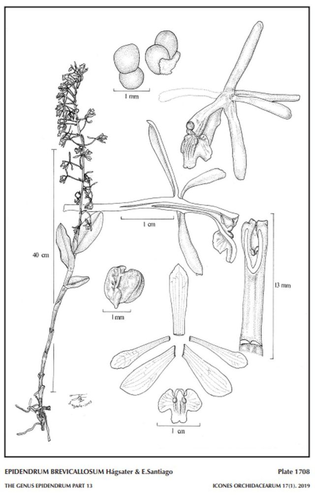 "Epidendrum brevicallosum belongs to the GROUP Ampelospathum which is characterized by the simple, cane-like, few leaved stems with a single, tubular, tight spathaceous bract at the base of a racemose, simple, erect inflorescence; the flowers resupinate. The new species is recognized by the tall plants 23.2" [58 cm] high, with 3 leaves 1.8 to 3.2" x .6 to 1.08" [4.5 to 8.0 x 1.5 to 2.7 cm], elliptic, apically rounded, inflorescence 12" [30 cm] long, petals .592 x .136" [14.8 x 3.4 mm], sub-spathulate, apex rounded; lip with sub-globose, widely separated small calli, and mid-lobe quadrate with the apex truncate and emarginate. Epidendrum chalmersii also from Cuzco, at 3050 m altitude, has smaller plants 8 to 12" [20 to 30 cm] tall, inflorescence 2.4 to 3" [6.0 to 7.5 cm] long, petals .48 x .92" [12 x 2.3 mm], narrowly lanceolate, obtuse, and lip with prominent slightly divergent calli, mid-lobe rectangular-oblong, wider at base. Epidendrum ampliracemum C.Schweinf. has similarly sized plants, ca. 16" [40 cm] tall, leaves 2.68 to 5.3 x 1.2 to 1.76" [6.7 to 13.3 x 3.0 to 4.4 cm], elliptic, apex obtuse, petals linear-oblanceolate, obtuse and oblique, lip 3-lobed, calli small, proximate, subglobose, slightly divergent, mid-lobe of lip sub-quadrate, apex truncate and minutely apiculate. Epidendrum aquilalatum Hágsater & E.Santiago has plants 12.8" [32 cm] tall, 2 leaves 2.32 to 3.2" x 1.12 to 1.4" [5.8 to 8.0 x 2.8 to 3.5 cm], elliptic, apically rounded, inflorescence 6.64" [16.6 cm] long, petals 7.2 x .68" [18 x 1.7 cm], linear-oblanceolate, falcate, acute, and the lip when spread is bird-like, the lateral lobes wing-like, obliquely semi-ovate, and basal half of mid-lobe sub-quadrate forming an isthmus, apical half strongly dilated forming a pair of semi-orbicular, strongly divaricate lobes and ending in a prominent apiculus." Hagsater etal 2019