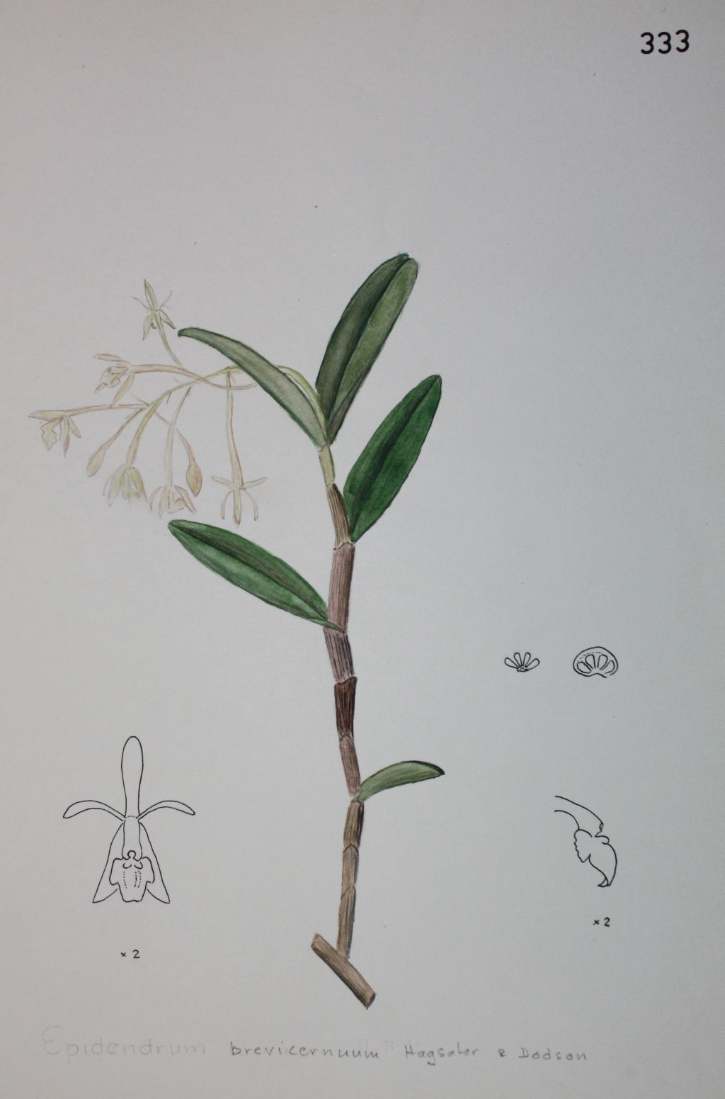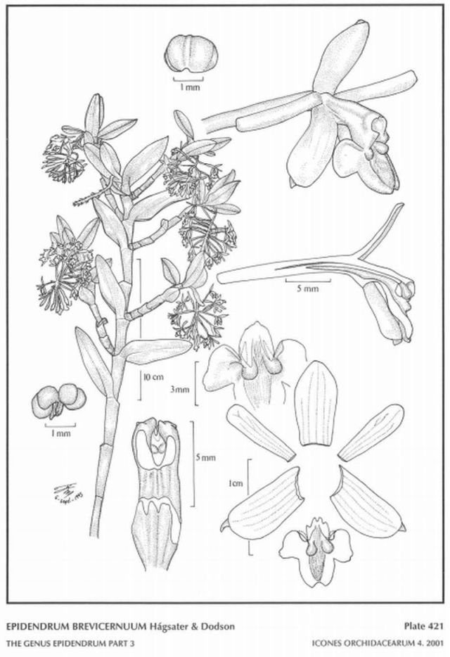 "Epidendrum brevicernuum belongs to the GROUP Andean SUBGROUP Cernuum characterized by the monopodial habit, cane-like stems with subapical branches which are considerably shorter than the main stem, coriaceous to sub-coriaceous leaves, and fleshy flowers, the lip entire or 3-lobed. The species has subspherical inflorescence, greenish white to green flowers, a 3-lobed lip, with the lobes subequal, the wide keel on the disk and the short dorsal keels of the 5-veined sepals, separate this species from E. cernuum Kunth which is close but has a long inflorescence, somewhat like a fox-tail, with brown and yellow flowers, the midlobe of the lip is longer than broad, the lateral lobes much smaller, the lateral sepals are prominently aristate, and the sepals 3-veined. Epidendrum guagra-urcuense Hágsater & Dodson has a pandurate lip and erose-fimbriate, funnel-shaped clinandrium, leaves up to 5.4 x 1.04" [13.5 x 2.6 cm]." Hagsater etal 2001