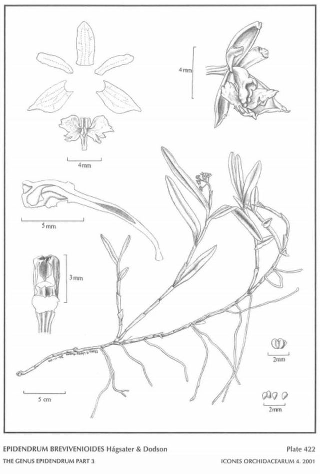 "Epidendrum brevivenioides is a member of the GROUP Brevivenium characterized by the repent rhizomes with erect, thin, few-leaved stems, and a pair of conduplicate tubular spathaceous bracts at the apex; the inflorescence is erect, with prominent floral bracts; the lip appears 7-lobed. The species can be recognized by the small inflorescence, peduncle with a tubular, acute spathe; 3-lobed lip appearing as 7-lobed due to the somewhat lacerate lateral lobes, the basal part suborbicular, crenulate and subacute, the following parts somewhat lacerate, subtriangular, rounded; midlobe subrectangular, truncate; 3 calli, the basal laminar, prominent, the central callus short, subglobose, with a low keel. Similar to Epidendrum brevivenium which has wider leaves, linear, acute petals, lateral lobes of the lip divided into filiform, divergent lobules. Epidendrum guanacasense Hágsater & Dodson has a more compact habit, shorter leaves, the lateral lobes of the lip with the margin sinuate, not deeply lacerate, clinandrium straight, not funnel-shaped. Epidendrum spathulipetalum Hágsater & Dressler has a similar lip, spathulate, erose petals, but belongs to the GROUP Neowilliamsia and does not have any spathe." Hagsater etal 2001