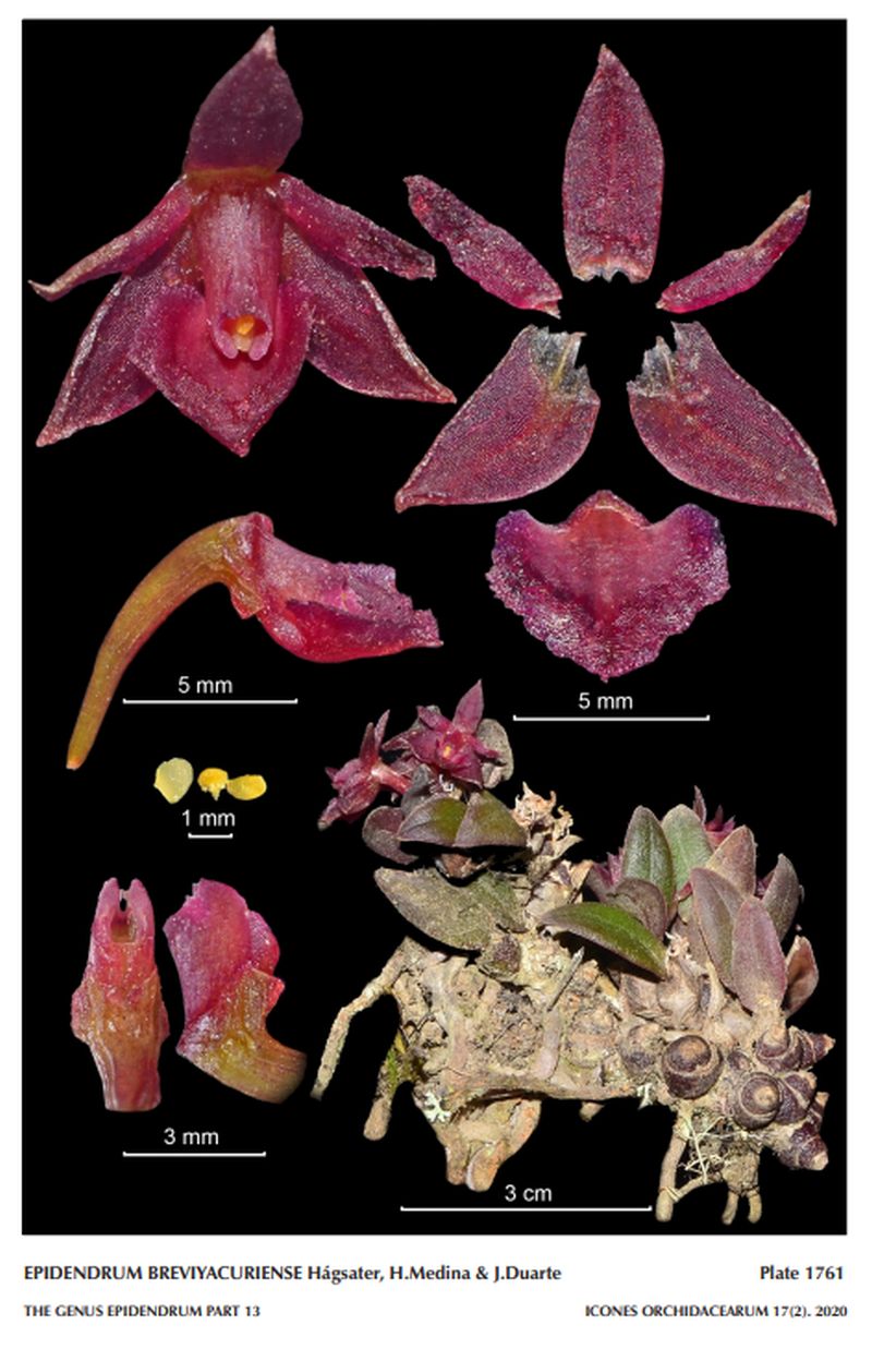 "Epidendrum breviyacuriense Hágsater, H.Medina & J.Duarte belongs to the GROUP Kalopternix SUBGROUP Serpens characterized by the aggregate, globose pseudobulbs with fleshy-coriaceous leaves, a sessile inflorescence, and one or few fleshy, compact, star-shaped flowers, often burgundy red in color, lip entire, more or less cordiform. The new species is recognized by the wine-red, globose, homoblastic pseudobulbs with a single apical leaf, ovate, .52 to .76" x .24 to .28" [1.3 to 1.9 x 0.6 to 0.7 cm], and the 4 simultaneous flowers, resupinate, reddish-violet, sepals .236 to .24" x 1.04 to 1.28" [5.9 to 6.0 x 2.6 to 3.1 mm], lip widely cordiform, margin irregularly dentate-erose, and disc with a thin mid-rib from the base to the middle of the disc. Epidendrum yacuriense Hágsater & H.Medina has 1 lanceolate acute leaf 1.12 to 2.8" x .4" [2.8 to 7.0 x 1.0 cm], and up to 6 simultaneous wine-red, non-resupinate flowers with the column and margins and apex of sepals pale green, sepals .252 to .268" x .108 to .136" [6.3 to 6.7 x 2.7 to 2.9 mm], disc glabrous. It is vegetatively similar to Epidendrum pachycoleum Hágsater, O.Pérez & E.Santiago, but that species has green pseudobulbs, 2 elliptic leaves .4 to 1 x .02 to .4" [1.0 to 2.5 x 0.5 to 1.0 cm], sepals .28 to .292" [7.0 to 7.3 mm] long, and lip with a prominent mid-rib reaching the apex of the lip. Epidendrum macroillinizae Hágsater, Cisneros & J.Duarte has a single apical leaf, 1.64 to 3.24" x .68 to .72" [4.1 to 8.1 x 1.7 to 1.8 cm], and 2 pink-brown flowers, sepals .6 to .68" [15 to 17 mm] long, reflexed, petals .56" [14 mm] long. Epidendrum platyphylloserpens Hágsater is pendulous with 1 oblong-elliptic leaf 1.28 to 1.88" x ,68 to .88" [3.2 to 4.7 x 1.7 to 2.2 cm], and up to 9 successive reddish brown flowers, sepals 5-veined, .34" [8.5 mm] long. Epidendrum serpens Lindl. has 2 to 3 leaves per pseudobulb, 4 to 5 simultaneous flowers, and a sub-orbicular-ovate lip."Hagsater etal 2020