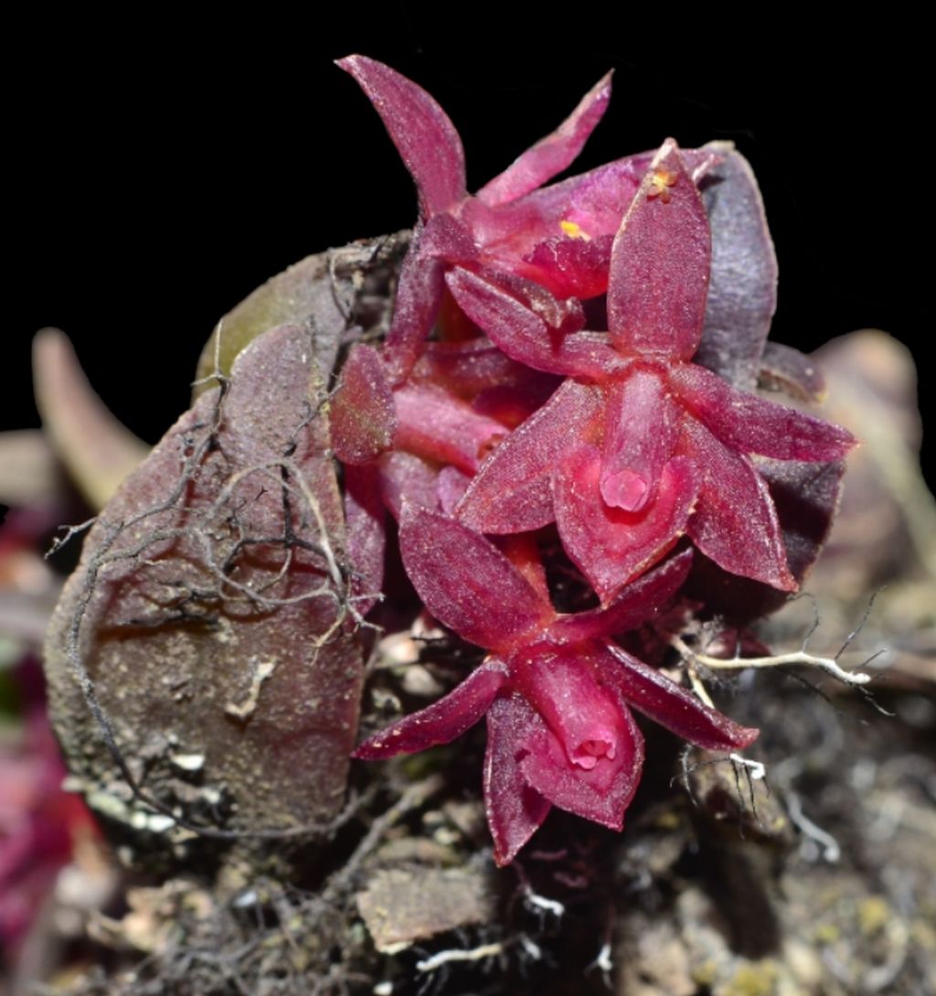 Found in Loja province of Ecuador on the western, dry side of the Andes, in sub-paramo montane forest above Jimbura, Yacurí National Park at elevations of 3000 to 3135 meters as a mini-minature sized, cold growing epiphyte with stems formed by 3 very short internodes, the last a pseudobulb, small, globose, compact, wine-red, homoblastic, covered when young by 2-3 non-foliar, imbricated, embracing, somewhat striated when dry sheaths and lacking in old pseudobulbs carrying at the apex of the pseudobulb, a single, coriaceous, ovate, margin hyaline, erose leaves that blooms in the late winter and early spring and and again in the late summer and early fall on a terminal, without a spathe, peduncle abbreviated, apical, racemose, sessile, simultaneously 4 flowered inflorescence with triangular, acuminate, embracing, much shorter than the ovary floral bracts and carrying resupinate, reddish violet flowers with the concave base of lip somewhat deeper red and the fragrance was not registered.
