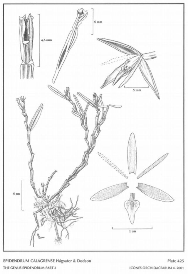 "Epidendrum calagrense Hágsater & Dodson belongs to the GROUP Ramosum SUBGROUP Flexicaule charactereized by the straggling plant habit, where the main stem is not very evident, and the sepals have a dorsal keel which is generally prominent. The species is recognized by the branching habit, distichous 2-flowered inflorescence and short, narrow leaves (less than .2 x .32" [5 x 0.8 cm], the elongate, triangular lip which is narrowed at the middle and the narrow, linear petals. Epidendrum paradisicolum Hágsater & Carda-Cruz has smaller flowers, the cordiform lip as wide as it is long, and the column short and thick, somewhat arched. Epidendrum urichianum Carnevali, Foldats & 1. Ramírez has wider leaves, is 1 to 5 flowered and the lip cordiform-triangular with a truncate callus. In Epidendrum antillanum the lip is triangular, the callus terminates in 3 short keels and the petals are proportionately wider, 5-veined." Hagsater etal 2001