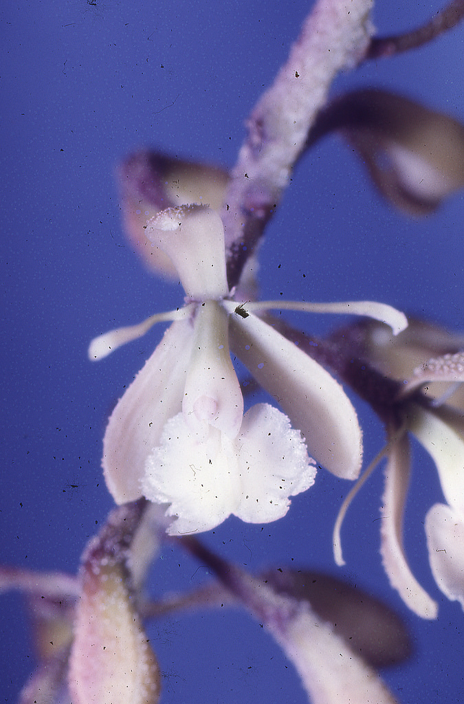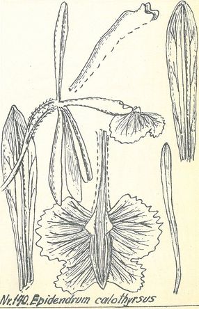"Epidendrum calothyrsus Schltr. is part of GROUP Sodiroi characterized by the sympodial, caespitose, cane like stems, paniculate inflorescence, leaves with prominently marked veins, flowers with an entire lip and the margin erose to fimbriate and has filiform petals. The species has muricate ovaries, very large bracts at the base of the inflorescence and the lip is deeply erose." Adapted from Plate 161 Hagsater etal 1993