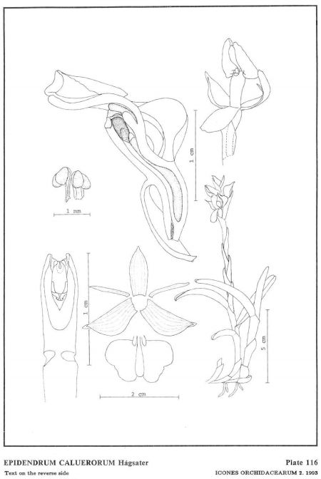 "Epidendrum caluerorum belongs to the GROUP Spathiger SUBGROUP Coriifolium characterized by the sympodial habit, coriaceous leaves, and the racemose, distichous inflorescence carrying fleshy green to purplish flowers. The speciescan be distinguished by the 3 5 linear to narrowly elliptic leaves, the inflorescence longer than the leaves, the acute bracts about as long as the ovary and subparallel to the rachis, the successive flowers of which 3 to 4 are open at the same time, and the bicallose lip. E. coriifolium has a short, compact plant, inflorescence about as long as the apical leaf and simultaneous flowers. E. allochronum Hágsater has narrowly rounded, spreading bracts and produces one flower at a time. E. beharorum Hágsater has a much longer, many-flowered successive inflorescence and truncate bracts. Epidendrum magnibracteatum Ames 1922 has acute bracts but many-flowered inflorescences. E. summerhayesii Hágsater has short, imbricating, rounded bracts dotted with purple. . E. coriifolium has acute bracts and narrow leaves." Hagsaterr etal 1993
