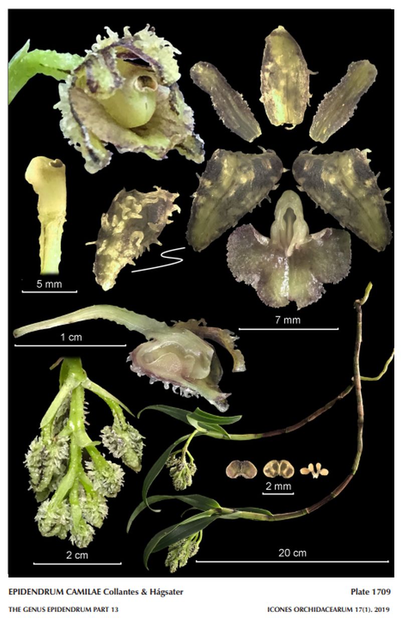 "Epidendrum camilae belongs to the GROUP Diothonea which is characterized by the branching plants, linear lanceolate to oblong, bilobed leaves, racemose, arching-nutant inflorescence, membranaceous flowers (rarely fleshy), the entire to 3-lobed, ecallose lip with the margin erose without or with 1 to 10 thin, smooth to erose ribs, the column completely to obliquely united to the lip. The new species has leaves to 3.2" [8 cm] long, sepals dorsally prominently conically to sub-conically uncinate, lip 3-lobed, base narrowly saccate with the column, within the column with a pair of prominent laminar winged ribs attached to the sides, and with a prominent laminar mid-rib at the bottom of the sac, outline like a bell-shaped curve, all this hidden by the column; free portion of lip flat, 3-lobed, ecallose, margin erose, formed by lateral lobes dolabriform, semi-orbicular, mid-lobe transversely reniform, forming two shallow, curved lobules, apex emarginate. Epidendrum astetei Hagsater, Collantes & Mormontoy is very similar but has shorter leaves, to 5.8 cm long, also has prominently uncinate sepals, lip nearly totally united to the column, 3-lobed, basally sac-like; disc with two pairs of blade-like ribs, the inner pair well developed, sigmoid-folded, with the anterior borders visible below the apex of the column as a pair of folded calli, with a prominent hemi-cordate mid-rib hidden in between the inner sides of the inner pair; the basal pair smaller in size, sigmoid, transversely sub-rectangular, sub-retuse. Epidendrum trachypentatropis Hágsater & E.Santiago has small reddish flowers, dorsally muricate sepals .22 to .228" [5.5 to 5.7 mm] long, and the sack-like lip nearly totally united to the column, with 5 prominent, unequal, flat, laminar keels hidden below the column. Epidendrum trachysepalum Hágsater has up to 9 to 11, pale pink to yellowish brown flowers with wine-red veins, the sepals are strongly muricate, the lip totally free from the column and is adorned with 3 thin, ribs at the base of the lip, the lateral pair is “U” shaped, and the mid-rib only appears on the disc, so on the disc it appears to be 5-ribbed." Hagsater etal 2019
