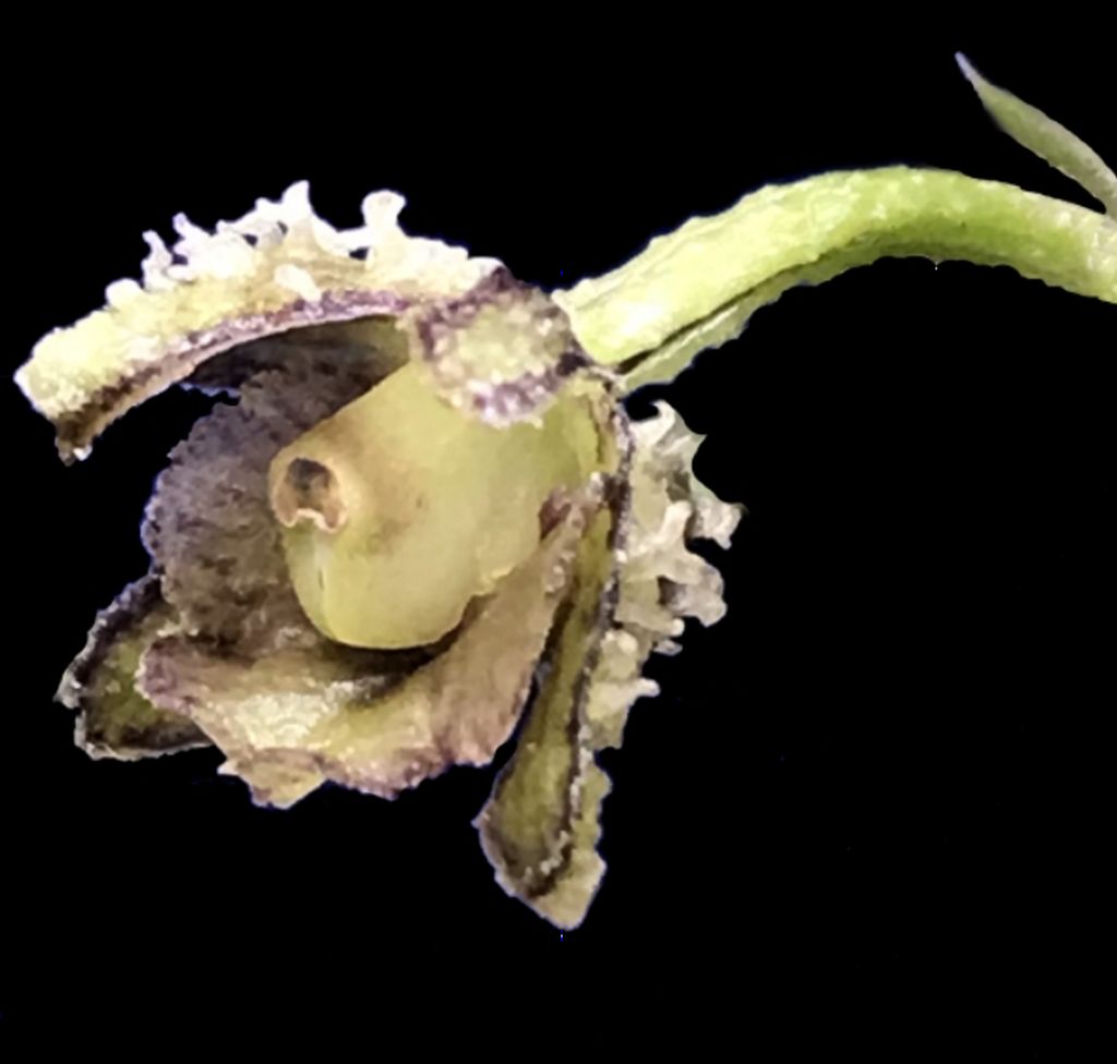 Found in Urubamba province of southern Peru, on the upper slopes of the Cordillera of the Andes in the Santuario Histórico de Machu Picchu on Polylepis pauta , at elevations around 2910 meters as a small sized, cold growing epiphyte with new stems generated from a middle internode of the previous stem, stems cane-like, terete, thin, straight stems carrying 8 to 13, distributed throughout the stem, only 2 to 6 present towards the apex of the stem at flowering, distichous, articulate, sub-coriaceous; bracts tubular, striated; blade linear-lanceolate, apex sub-obtuse to sub-acute, conspicuously minutely apiculate leaves that blooms in the late spring on a terminal, without a spathe, peduncle 1 to 1.2"x .04" [25 to 30 x 1 mm] racemose, short, pendulous, at anthesis successive from the base of the inflorescence, densely 7 to 10, flowered, inflorescence with covering 2/3 of the ovary, the basal ones longer, shorter towards the apex, narrowly triangular, embracing, margin scarcely papillose, the papillae conical floral bracts and carrying resupinate flowers with the sepals and petals pale green, purple towards the margins with the margin pale green, lateral lobes of lip pale green, lip mid-lobe pale green, the margin suffused pale green to pale purple, column pale green, dorsally towards the apex pale purple, anther pale green, with the center dark purple, fragrance a combination of vanilla and urine yum!