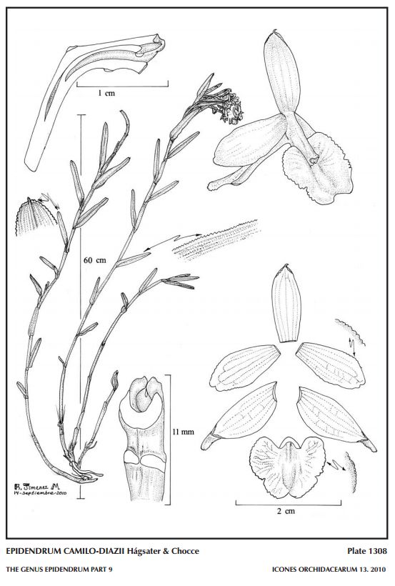 "Epidendrum camilo-diazii belongs to the GROUP Coronatum SUBGROUP Aristisepalum, which has a caespitose habit, simple stems, sub-coriaceous leaves, a racemose inflorescence without spathaceous bracts, and the aristate sepals. The species is recognized by the stems to 36" [90 cm] tall, bright orange-red flowers, bilobed, emarginate lip with a single wide, low, fleshy keel, and straight, obovate, emarginated petals, sepals and petals 5-veined, and a long .44 to .48" [11 to 12 mm], straight column. It is very similar to Epidendrum vegae Chocce & Hágsater which is a short, lithophytic herb, stems to 7.6" [19 cm] tall, has large red to bright orange flowers with a short .28" [7 mm], thin column, 5-veined sepals and petals, the lip 3- lobed with 3 low parallel keels, and a very small, semi-orbicular, entire, mid-lobe. It is closely related to Epidendrum jalcaënse which is epiphytic and to 22.4" [56 cm] tall, petals 6-veined, the 3-lobed lip has 3 to 5 keels, the mid-lobe is emarginate forming a couple of semiorbicular lobes, and the .4" [10 mm] long column is stout and thick." Hagsater etal 2010