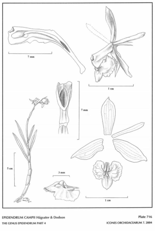 "Epidendrum campii belongs to the GROUP Alpicolum SUBGROUP Pergracile , which is characterized by the subcaespitose habit, long spathaceous bract wlth parallel sides, lax-flowered, racemose inflorescence, membranaceous flowers, 3-lobed lip which is not fleshy-thickened. The species is recognized by the hemi-elliptic midlobe of the lip, about as wide as it is long, and the petals are 1-veined, about 1/3 the width of the dorsal sepa!. Epidendrum rhodoides has a subquadrate midlobe of the lip, the 5-veined petals are as wide as the dorsal sepal. Epidendrum vidal-senegei Hágsater & Dodson, has larger flowers, the sepals .52 to .64" [13 to 16 mm] long, and the single veined petals are linear, less than half as wide as the sepals, the leaves somewhat wider, .28 to .36" [0.7 to 0.9 cm], and the midlobe of the lip rectangular, 3 to 4 times longer than wide." Hagsater etal 2004