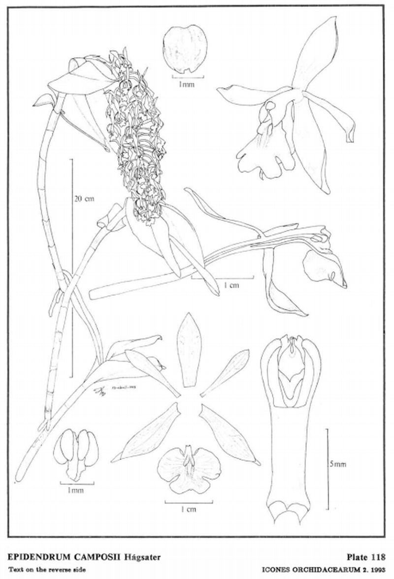 "Epidendrum camposii is part of GROUP Arbuscula SUBGROUP Arbuscula characterized by the successive lateral growths arising from the middle of the previous stem and carrying a few leaves aggregate towards the apex that blooms on an arching, terminal inflorescence with membraneous, colorful flowers with a bicallose lip. The very pale pink and white flowers with two white calli on the lip, which are continuous with two lateral low keels, characterize E. camposii. Epidendrum magnificum Schltr. has deep pink to deep purple flower and is found only in Guerrero state of Mexico. Epidendrum greenwoodii Hágsater grows sympatrically with E. camposii, but the flowers are orange yellow and the lip is differently shaped. Epidendrum nicaraguense Scheeren ex Hágsater, on the other hand, has light pink flowers with bright, deep yellow, subglobose calli." Hagsater etal 1993