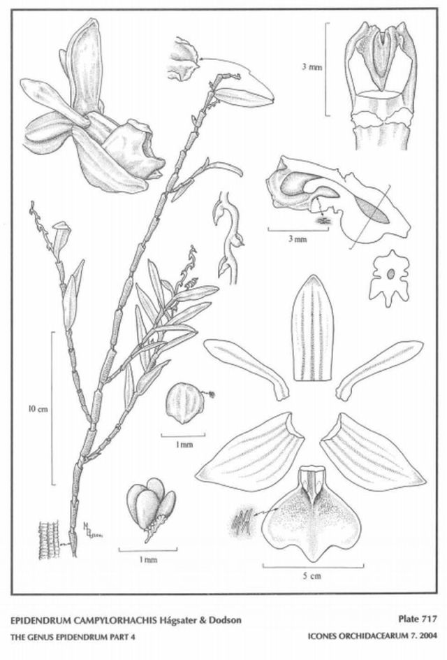 "Epidendrum campylorhachis belongs to the GROUP Aquaticum, which has branching stems, distichous inflorescences, small, fleshy flowers and pubescent nectaries. The new species has a three-lobed lip with the base cuneate, narrowly oblanceolate petals and an oblique, deeply triquetrous ovary, with the rachis segments prominently incurved below each bract. It closely resembles Epidendrum lindae which has larger, wider leaves, the rachis flexuous so that the bracts are somewhat retrose, linear petals and a terete ovary, the lip is slightly cuneate with the lateral lobes subquadrate. Epidendrum carnosiflorum C. Schweinf. has larger flowers, the dorsal sepals .4 to .44" {10 to 11 mm] long, and a three-lobed lip, the midlobe much larger than the lateral lobes. Epidendrum ruguosum Schltr. has larger, linear-oblong leaves and larger flowers, with the lip suborbicular and sepals .44" [11 mm] long. Epidendrum stenocalymmum Hágsater & G. Calatayud has small, ovate, leaves, a simple, erect raceme, entire, oblanceolate, unguiculate petals and the cuneate lip forming a deep sac in front of the column, so that the column is not visible." Hagsater etal 2004