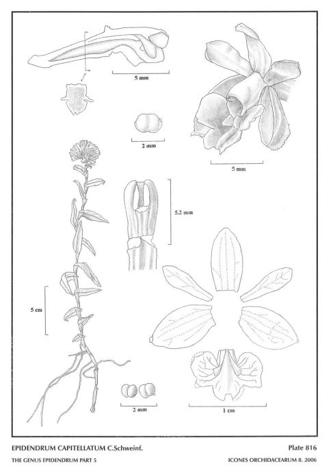 "Epidendrum capitellatum belongs to the GROUP Capitellatum which is characterized by the erect, succulent stems with non-articulate leaves, with a spherical head of fleshy greenish flowers, and without any spathaceous bract. The species is recognized by the thin, tall stems produced from an elongate repent rhizome, succulent straight leaves, not decurved towards the apex, corymbose, spherical inflorescence and the simultaneous white or green flowers with a 3-lobed lip, the smaller midlobe notched and thus bidentate at the apex, the lateral sepals prominently keeled, the laminar keels continuing down the ovary, the margin of the keels erose. It is closely related E pterogastrium , which has a compact, short habit, the fleshy leaves decurved towards the apex, the lip cordate- reniform, with the margin erose and the lip bicallose. The appearance of the stem is somewhat like that of E. vesicaule L.O.Williams but that species has articulate leaves and 2 flowers subtended by semiorbicular, spathaceous bracts." Hagsater etal 2006