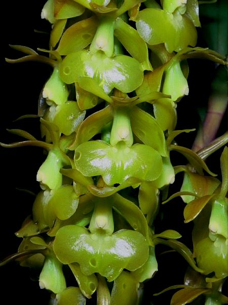 Found in Colombia and Ecuador on trees at elevations of 1300 to 2800 meters as a medium sized, cool to cold growing epiphyte with successive forming stems arising from the middle internode of the previous, straight, reed-like stem and enveloped below the leaves by old, leaf-bearing, tubular, inflated sheaths and carrying towards the apex, a few, elliptic, acute, basally clasping leaves and blooms in the fall on a terminal, racemose, arcuate, short inflorescence carrying a few, simultaneous, resupinate flowers.