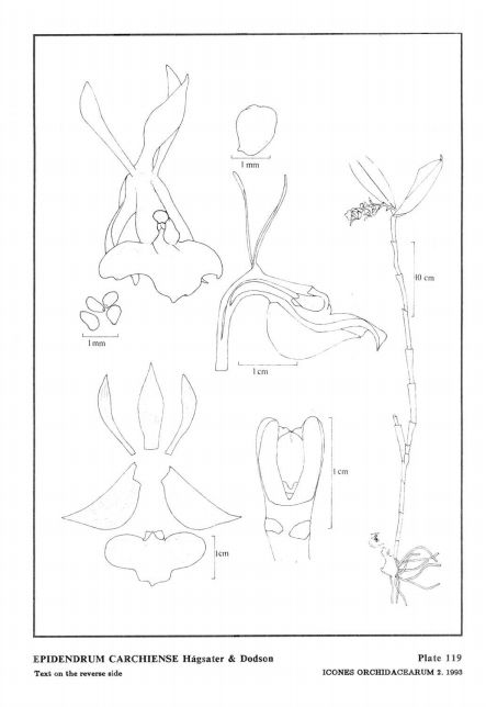 References W3 Tropicos, Kew Monocot list , IPNI ; *Icones Orchidacearum 2 The Genus Epidendrum Part 1 Plate 119 Hagsater 1993 drawing fide; Native Colombian Orchids Vol 5 COS 1994 photo soso; Native Ecuadorian Orchids Vol 2 Dodson 2001 photo fide; Icones Orchidacearum 8 Plate 844 Hagsater 2006; Icones Orchidacearum 9 Plate 927 Hagsater 2007 see recognition section; Icones Orchidacearum 15 [1] Plate 1568 Hagsater & Sanchez 2015 see recognition section; Orquideas, Tesoro de Colombia Vol 2 Ortiz & Uribe 2017 as E aff carchiense photo fide to not carchiense; Orquideas, Tesoro de Colombia Vol 2 Ortiz & Uribe 2017 drawing fide; Icones Orchidacearum 17(1) Plate 1784 Hagsater & Jimenez 2019 see recognition section;