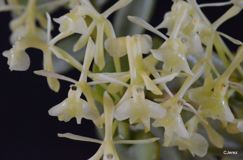 Found in Venezuela and Colombia? at elevations of 800 to 1800 meters as a miniature to small sized, warm to cool growing epiphyte with simple, cane-like, somewhat laterally compressed, flexuous stems carrying 4 to 12, narrowly elliptic, bilobed leaves that blooms in the later spring through late summer on a terminal ocuring only once, sessile, simultaneously 3 to 10 flowered inflorescence with resupinate, white greenish flowers.