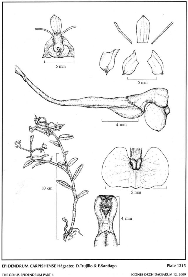 "Epidendrum carpishense belongs to the GROUP Andean SUBGROUP Soratae which is characterized by the branching habit starting on a monopodial, primary stem, infundibuliform, rugose leaf-sheaths, lanceolate, aristate, acute leaves, racemose subcapitate inflorescence on a short, thin peduncle, and the bicallose lip. The species is recognized by the small plants ca. 6" [15 cm] tall, scarcely branched, with linear-lanceolate, fleshy leaves to 1" [2.5 cm] long, 3 to 4 creamy yellow flowers, sepals .18 to .2" [4.5 to 5 mm] long; lip reniform with the margin entire, bicallose, the calli prominent, reaching the center of the lip. Epidendrum moscozoi Hágsater & E.Santiago, has plants about as tall, but produces the inflorescence from very short branches and thus appear to be lateral on the stems, with 3, white-colored flowers, the lip reniform with the base cordate, margin crenate, and very short calli. Epidendrum soratae Rchb.f. has taller plants to 10.8" [to 27 cm] with lanceolate leaves .68 to 1,88" [1.7 to 4.7 cm] long, 8 to 12, green or yellowish green flowers, sepals .268 to .28" [6.7 to 7 mm] long, and the lip reniform, slightly 3-lobed at the apex. Epidendrum obliquum Schltr. has plants to 22.8" [57 cm] tall, lanceolate leaves .4 to 1.6" [1 to 4 cm] long, and the reniform lip has a slightly emarginate apex and the ovary is not inflated." Hagsater etal 2009