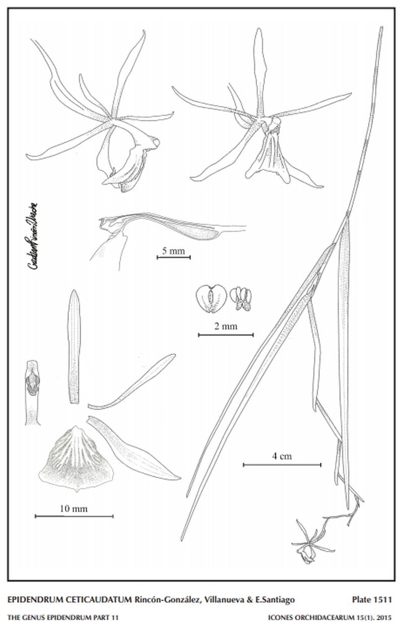 "Epidendrum ceticaudatum belongs to the GROUP Physinga which is characterized by to the generally small, caespitose plants, the inflorescence apical and racemose producing new racemes with time and thus pluriracemose, the successive flowers opening one at a time on an elongate peduncle with acuminate bracts, the lip entire and the ovary with a prominent vesicle. The species is recognized by the bell-shaped lip, apex truncate, minutely apiculate, petals .528 x .044" [13.2 x 1.1 mm] long, lateral sepals slightly falcate, 54.8 x .088" [13.7 x 2.2 mm] long, slightly arched column of .32" [8 mm] long. It is closely resembles Epidendrum hellerianum which has a 3-lobed lip, and larger flowers, petals .12 x .08" [30 x 2 mm], lateral sepals linear 1 to 1.2" x .12 to .16" [25 to 30 x 3 to 4 mm], column straight o.6 to .68" [15 to 17 mm] long." Hagsater etal 2015