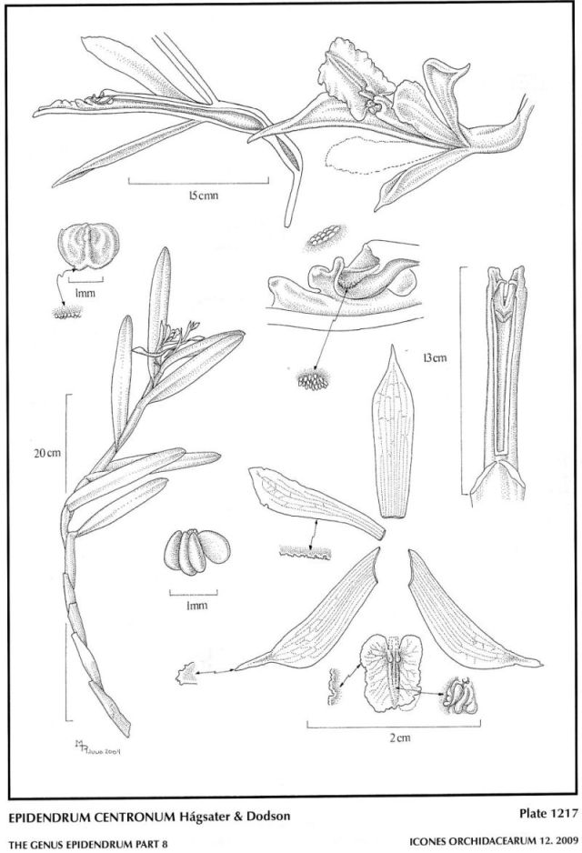 "Epidendrum centronum belongs to the GROUP Andean SUBGROUP Vernixium, characterized by the monopodial, branching stems, erect inflorescences, lax flowered, the flowers non-resupinate, the lip more or less 3-lobed. The species is recognized by the oblong-lanceolate to oblong-elliptic, .32 to .52" [8 to 13 mm] wide leaves, the short peduncle of the inflorescence, 1.4" [3.5 cm] long, 6 successive, green flowers, the lip tinged brown, sepals .8 to .84" [20 to 21 mm] long, prominently aristate, and the panduriforme lip, slightly longer than wide. Epidendrum pozoi Hágsater & Dodson is vegetatively very similar, but the inflorescence is longer, 2.4 to 4" [6 to 10 cm] long, the flowers green, concolor, (turning yellow with age), the ovary elongate, .136 to .248" [34 to 62 mm] long, and the lip clearly 3-lobed. Epidendrum panduratum Hágsater & Dodson has wider, ovate-elliptic leaves, the apex retuse, the densely, 6 to 12 flowered inflorescence of simultaneous, pink-green flowers, the sepals .6 to .64" [15 to 16 mm] long and minutely apiculate." Hagsater etal 2009