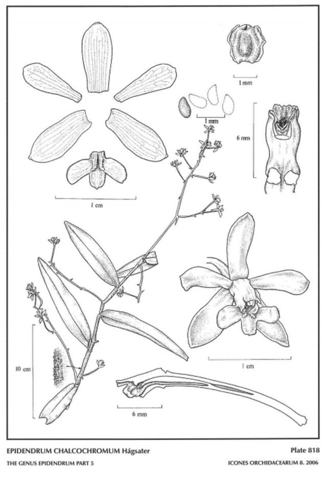 "Epidendrum chalcochromum belongs to the GROUP Oerstedella which is characterized by the sympodial habit, mostly verrucose stems, and the rostellum which is transverse to the column instead of parallel, forming a wide, open sinus, SUBGROUP Intermixtum which has small membranaceous flowers with a petaloid, usually bifid clinandrium-hood, and obovoid, laterally compressed pollinia with long, granulose caudicles. The new species is recognized by the long lateral inflorescences, 1.6 to 3.8" [4 to 9.5 cm] long, the 3-lobed lip with the midlobe entire and similar in size to the lateral lobes, the flowers reddish brown on olive-green, and the clinandrium-hood entire. It is very similar to Epidendrum intermixtum which is nearly identical, but the flowers are a clear pale green, with the clinandrium-hood bifid, deeply cleft; the shorter lateral inflorescences .4 to 2" [1 to 5 cm] long. In Panama there are several species with a 3-lobed lip where the midlobe is entire, and produce apical and lateral inflorescences: E. folsomii, E. fortunae Hágsater & Dressler and E. fuscinum (Dressler) Hagsater." Hagsater etal 2006