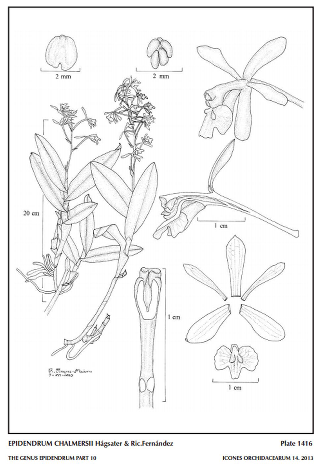 "Epidendrum chalmersii belongs to the GROUP Ampelospathum which is characterized by the simple, cane-like, few leaved stems, with a single, tubular, tight spathaceous bract at the base of a racemose, simple, erect inflorescence, the flowers resupinate. The species is recognized by the relatively small planta 8 to 12" [20 to 30 cm] tall including the inflorescence, with 3 to 4 elliptic leaves 2 to 3.6" x .8 to 1.2" [5 to 9 x 2 to 3 cm], the 6 to 10 flowered inflorescence, lateral sepals obovate-oblanceolate, .44" [11 mm] long, and the mid-lobe of the lip truncate and minutely bilobed at the apex. Epidendrum ampliracemum has larger leaves, 2.4 to 5.2" x 1.6" [6-13 x 4 cm], a many-flowered inflorescence, elongate 7.6" [19 cm] long lateral sepals oblanceolate .68 to .72" [17 to 18 mm] long, and the mid-lobe cuneate, sub-obtuse, minutely apiculate." Hagsater etal 2013