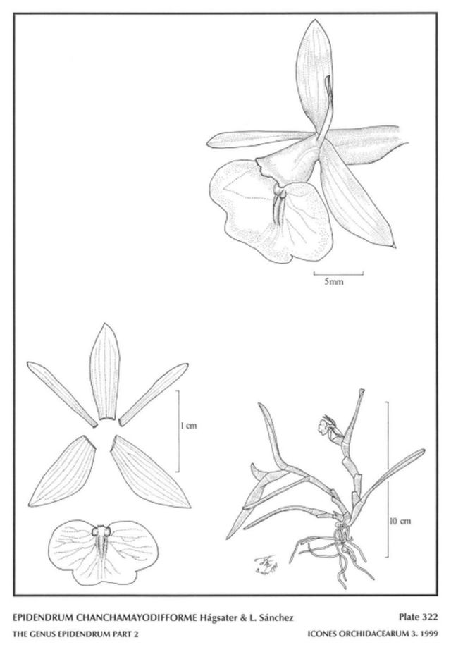 "Epidendrum chanchamayodifforme is part of GROUP Difforme characterized by the caespitose, sympodial plants, fleshy, pale green to glaucous leaves, apical inflorescence, sessile, rarely with a short peduncle, one-flowered to many-flowered, and then corymbose, without spathaceous bracts, fleshy, green to yellowish-green rarely white flowers. This species can be recognized by the short plants, linear to lanceolate ascending leaves, single flower, ovary with a vesicle, lip 3-lobed, dentate clinandrium. It is similar to Epidendrum scharfii which has 7.2" [18 cm] tall plants, ovate-elliptic leaves, 3 to 4 flowers with an entire, reniform lip." Hagsater etal 1999