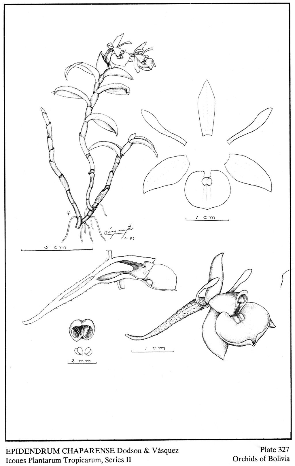 References W3 Tropicos, Kew Monocot list , IPNI ; *Icones Plantarum Tropicarum Plate 327 Dodson & Vasquez 1989 drawing fide; Orchids of Bolivia VolII Laelinae Vasquez & Isisch 2004 drawing/photo fide; Icones Orchidacearum 15 [2] Plate 1581 Hagsater & Sanchez 2016 see recognition section; Icones Orchidacearum 15 [2] Plate 1599 Hagsater & Sanchez 2016 see recognition section; Icones Orchidacearum 18(1) plate 1805 2020 drawing/photo fide; Icones Orchidacearum 18(1) plate 1824 Hagsater & Santiago 2020 ; The Parque Nacional Carrasco, Cochabamba Bolivia, Orquideas del Proyecto Hidroelectrico Ivirizu Website 2021 photo fide;