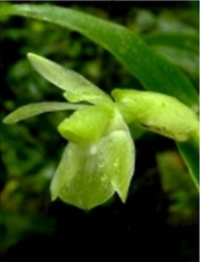 Found in the department of Cochabamba, Bolivia in wet montane tropical forests on steep embankments at elevations around 1880 meters as a small sized, cool growing epiphyte or terrestrial with branched, decumbent to erect stems enveloped by sheaths and carrying 5 to 7, towards the apex, distichous, pale green, elliptic leaves that blooms in the summer on a terminal, erect, very short, arising through a spathe, simultaneously 2 flowered inflorescence carrying flowers that are white with a greenish tint.