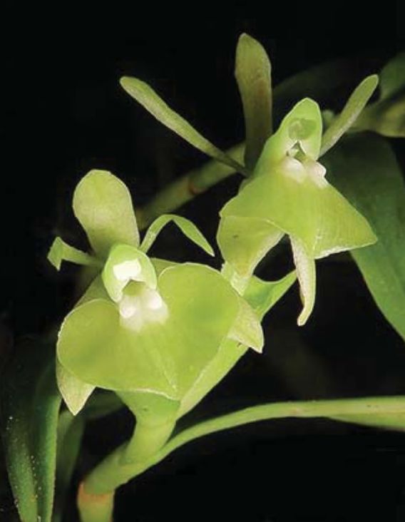 "Epidendrum chaparense is part of GROUP Megalospathum characterized by the caespitose but branching habit, many-leaved stem, fleshy, oblique leaves, a short, few flowered, raceme subtended by large semi-ovate spathaceous bracts, resupinate flowers, the column more or less united to the lip, and the SUBGROUP Vesicicaule, which has long, 3 to 8, narrow leaves, 8:1-20:1, and a simple lip. has shorter linear-lanceolate leaves, 1 x .32" [25 x 8 mm], a two-flowered inflorescence, flowers smaller, greenish white, sepals .52" [13 mm] long, lip sub-orbicular, with a pair of short, globose calli. Epidendrum falcivesicicaule has lanceolate leaves 1.12 to 2.12" x .32 to .52" [2.8 to 5.3 x 0.8 to 1.3 cm], a 2 flowered elongate inflorescence, with two imbricating spathes, flowers apple green, the calli and disc of the lip white, sepals .72" [18 mm] long, lip widely cordiform, with a pair of calli, elongate, prominent, on a thickened, rounded platform, white, spongy; growing at elevations of 1900 to 2700 meters; column straight, clinandrium-hood slightly incurved. Epidendrum vesicicaule has narrowly lanceolate leaves 1.4 to 2.4" x .16 to .32" [3.5 to 6.0 x 0.4 to 0.8 cm], an orbicular-cordiform lip with a pair of small, parallel, low calli, extended into an elliptic fleshy, thickened disc which nearly reaches the apex of the lip; column slightly upturned towards along the basal half, clinandrium-hood fleshy, truncate, straight; growing at elevations of 3500 to 3800 meters. Epidendrum miradoranum Dodson & D.E.Benn. has ovate-lanceolate leaves .48 to 1.08" x .2 to .4" [1.2 to 2.7 x 0.5 to 1.0 cm], a single apical spathe .64" [16 mm] long, and up to 4 green flowers slightly tinged pale pink, sepals .88 to 1" [22 to 25 mm] long, and the lip rectangular-reniform, with two short, sub-orbicular calli. Epidendrum cardiomorphum Hágsater & E.Santiago has somewhat larger leaves, 1.6 to 3.44" [4.0 to 8.6 cm] long, a single spathe subtending the inflorescence, pale green, membranaceous flowers, the lip cordiform with multiple thickened veins and two small calli, laterally compressed, the disc with three very thin, low, parallel ribs which disappear before the middle of the lip, and with multiple radiating thickened veins; clinandrium-hood slightly surpassing the body of the column, fleshy, straight. Epidendrum platypetalum Hágsater has narrowly ovate leaves, .2 to 1.84" x .12 to .44" [0.5 to 4.6 x 0.3 to 1.1 cm], sessile inflorescence subtended by a single spathe, reddish green flowers, the disc of the lip with small calli and white ribs, growing at elevations around 2500 meters. Epidendrum pachyclinium Hágsater & E.Santiago has obliquely lanceolate leaves, 1.12 to 3.32"x .24 to .44" [2.8 to 8.3 x 0.6 to 1.1 cm], a sessile, two-flowered inflorescence, sepals .68" [17 mm] long, the lip orbicular-cordiform with 2 laminar calli and 2 short, inconspicuous ribs; column arched, clinandrium-hood very fleshy, prominent and slightly upturned. Epidendrum lagotis Rchb.f. has ovate-elliptic leaves .8 to 2.4" x .4 to .92" [2 to 6 x 1.0 to 2.3 cm], a single obliquely semi-ovate spathe, sepals .68 to 1" [17 to 25 mm] long, petals widely spatulate, .84 x .32" [21 x 8 mm], and the lip orbicular, with a pair of small sub-spherical calli." Adapted from E falcivesicicaule Icones 15[2] Plate 1581 Hagsater etal 2016